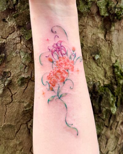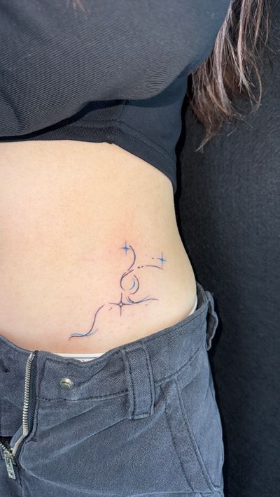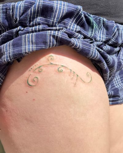 Abstract fine line & colour tattoos in London. Flowing, ornamental designs that follow your body’s rhythm. Custom only, gentle session.