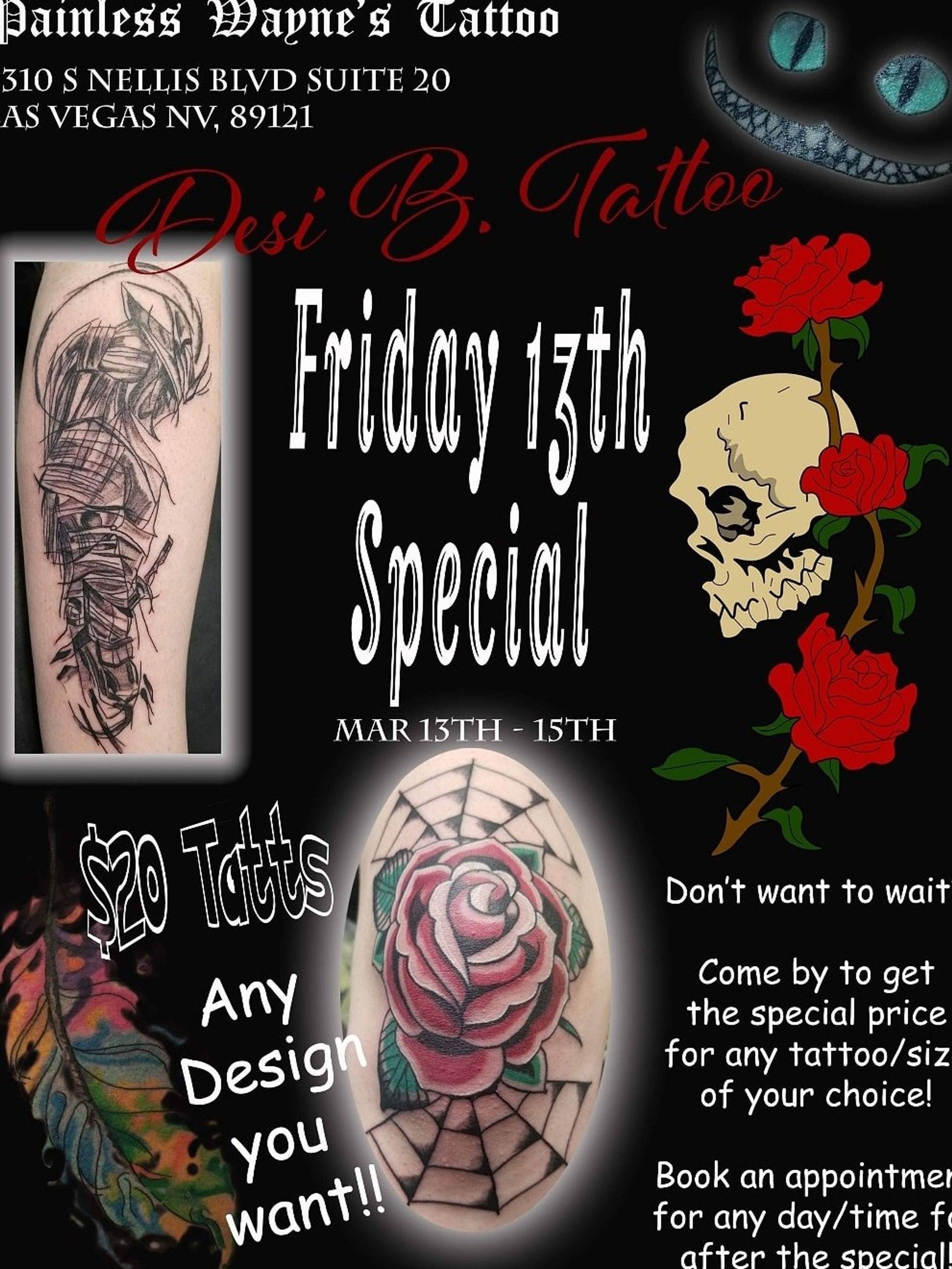 Come thru for our special! All weekend long, this friday 13th thru Sunday 15th!!! First come first serve, open at 10am! $20 for half dollar size..the max size i do during the special is 3x3inches..anything bigger u have to pay the special price upfront and schedule an appointment for after the weekend for anytime you want...or u can pay half of the special price as a deposit and pay the rest when u come in for ur appointment👌 checkout more of my work on imstagram @desi_b_tattoos.
