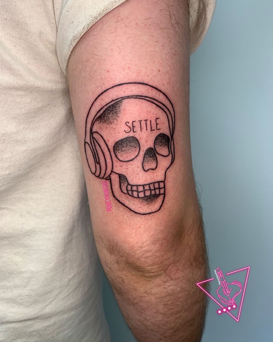 Hand-Poked Skull with Headphones Tattoo by Pokeyhontas @ KTREW Tattoo Birmingham, UK
