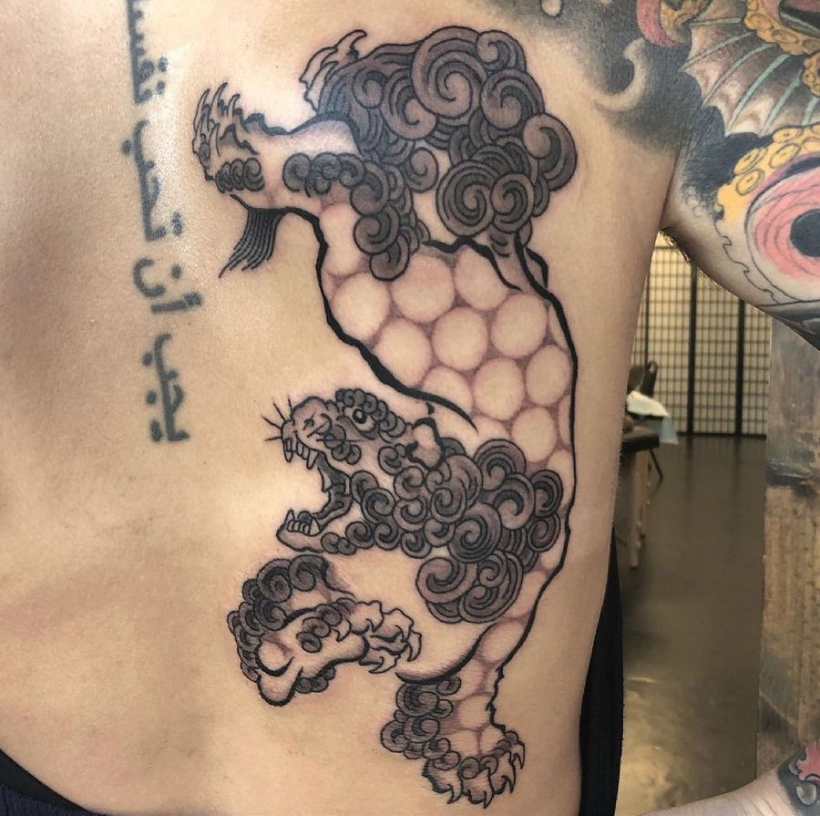 Foo dog tattoo made by Robert Johnson of the Bell Rose Tattoo in Daphne, Alabama.
