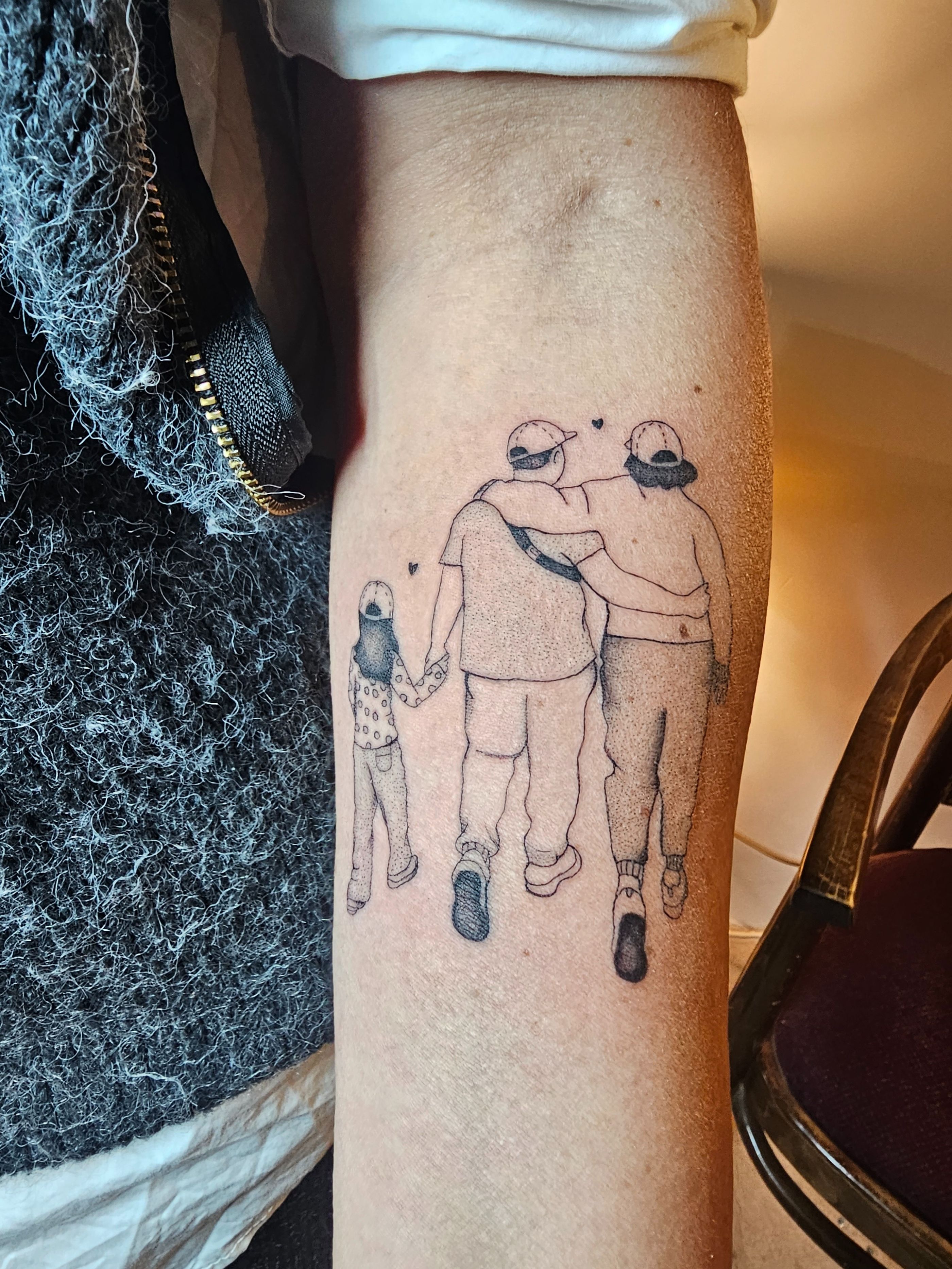 Unique dotwork and fine line illustrative tattoo design capturing the essence of family in elegant outline style by talented artist Katia Barria.
