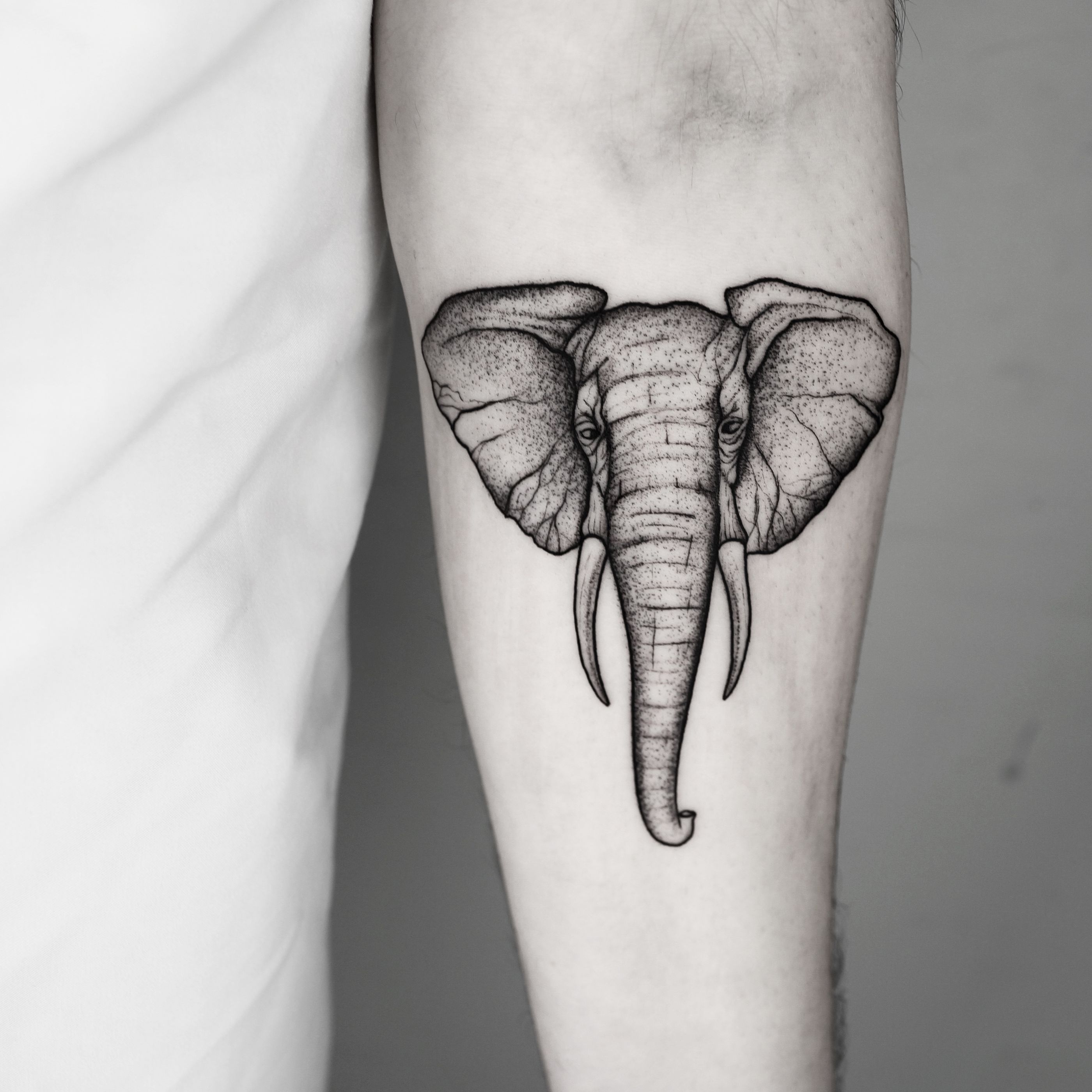 A beautifully detailed and illustrative black & gray elephant tattoo created by the talented artist Malvina Maria Wisniewska.