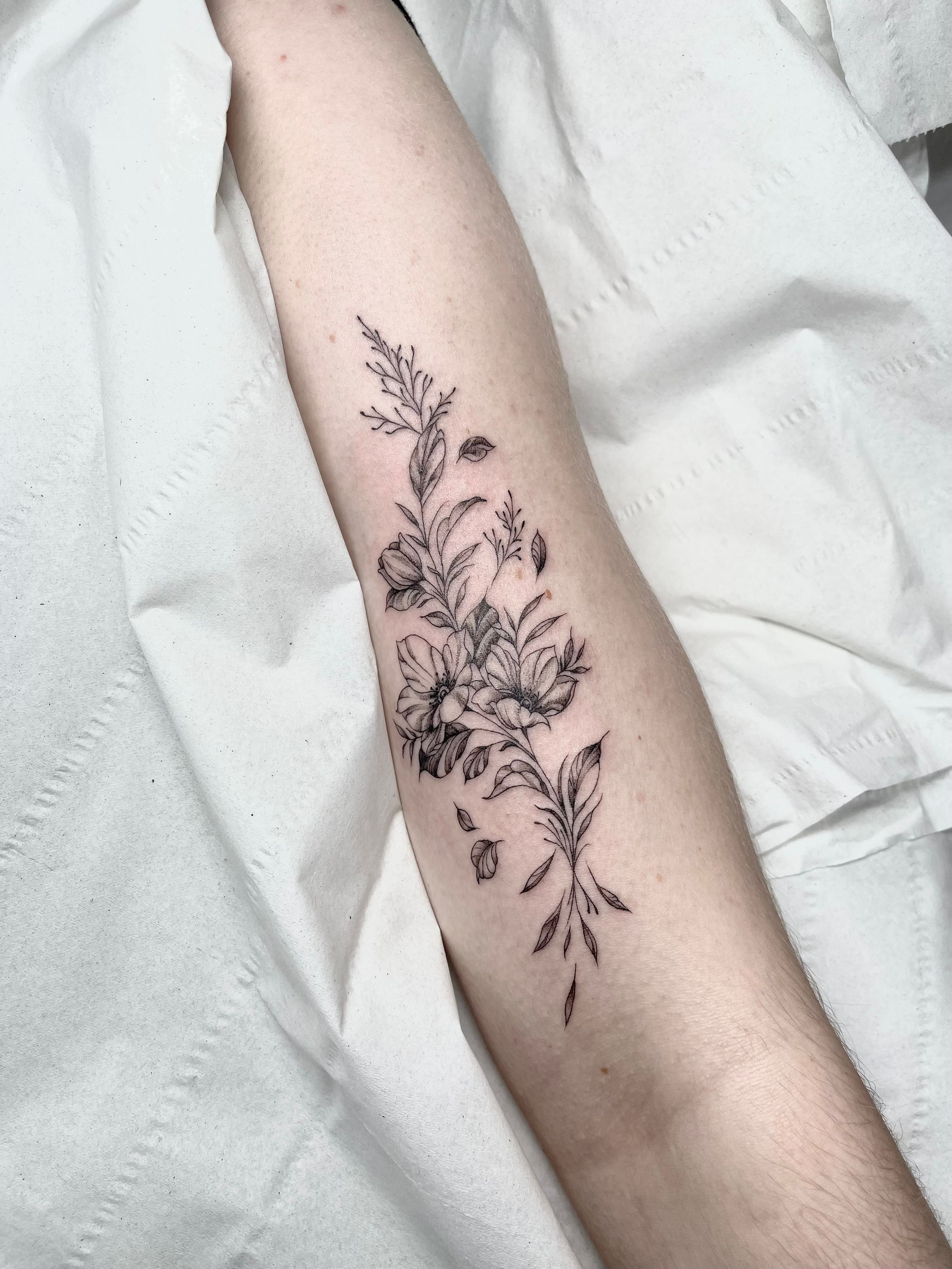 Elegant fine line tattoo featuring a beautiful floral motif with intricate branches, sprigs, and twigs. Perfect for lovers of minimalist botanical designs.