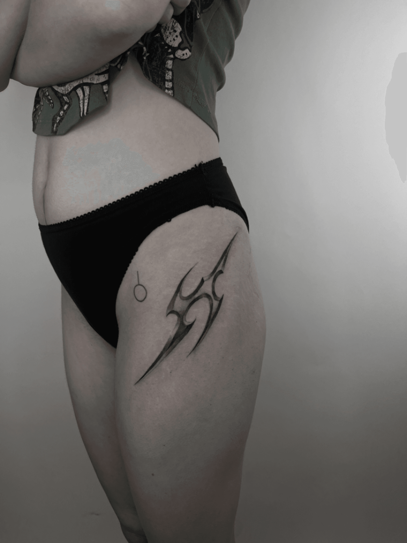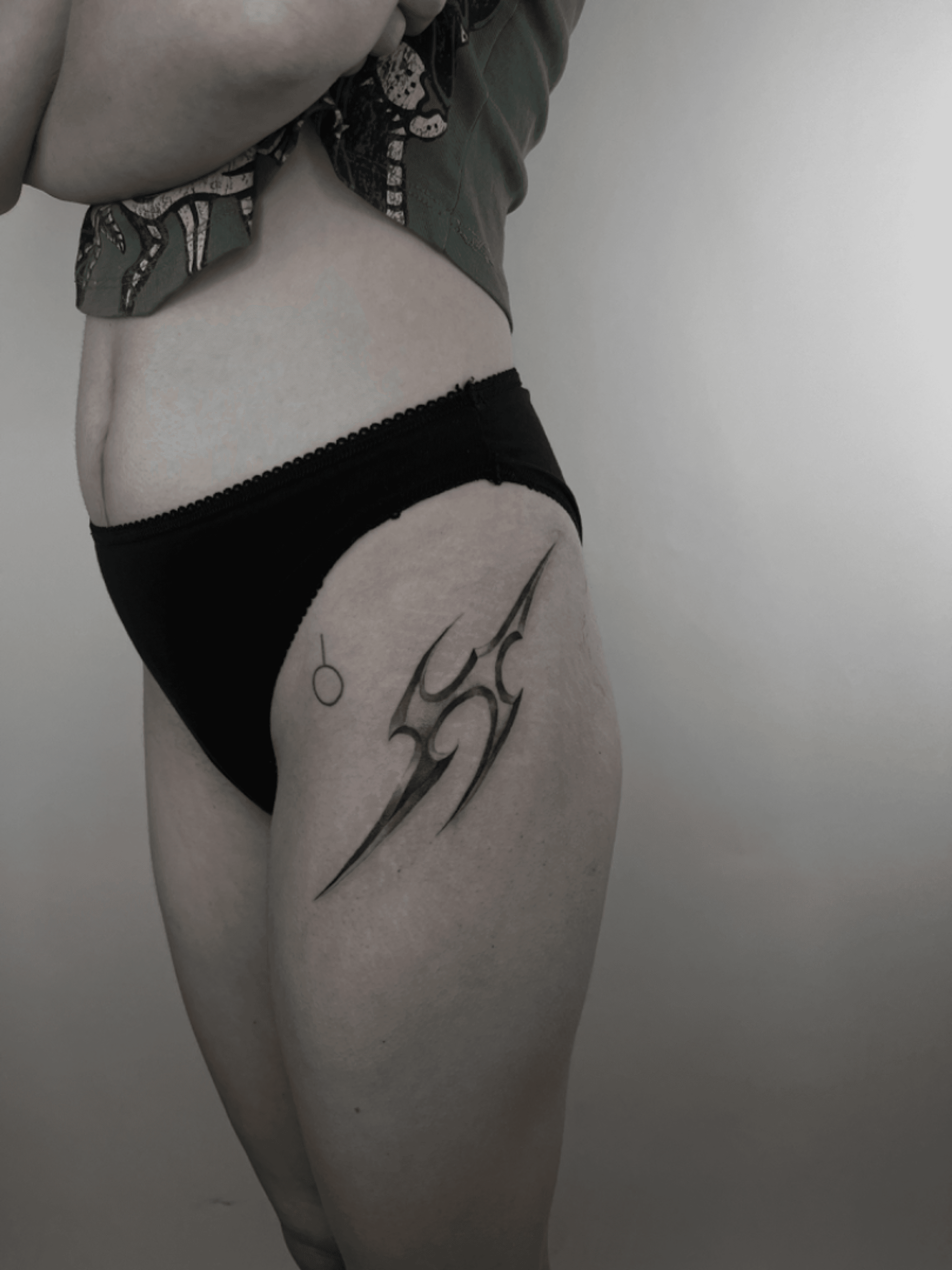 The tattoo is a tribal design in black ink, set on the hip. The style is geometric and stylized, with bold lines and gradients to give a 3D effect. The overall feel is edgy and bold.