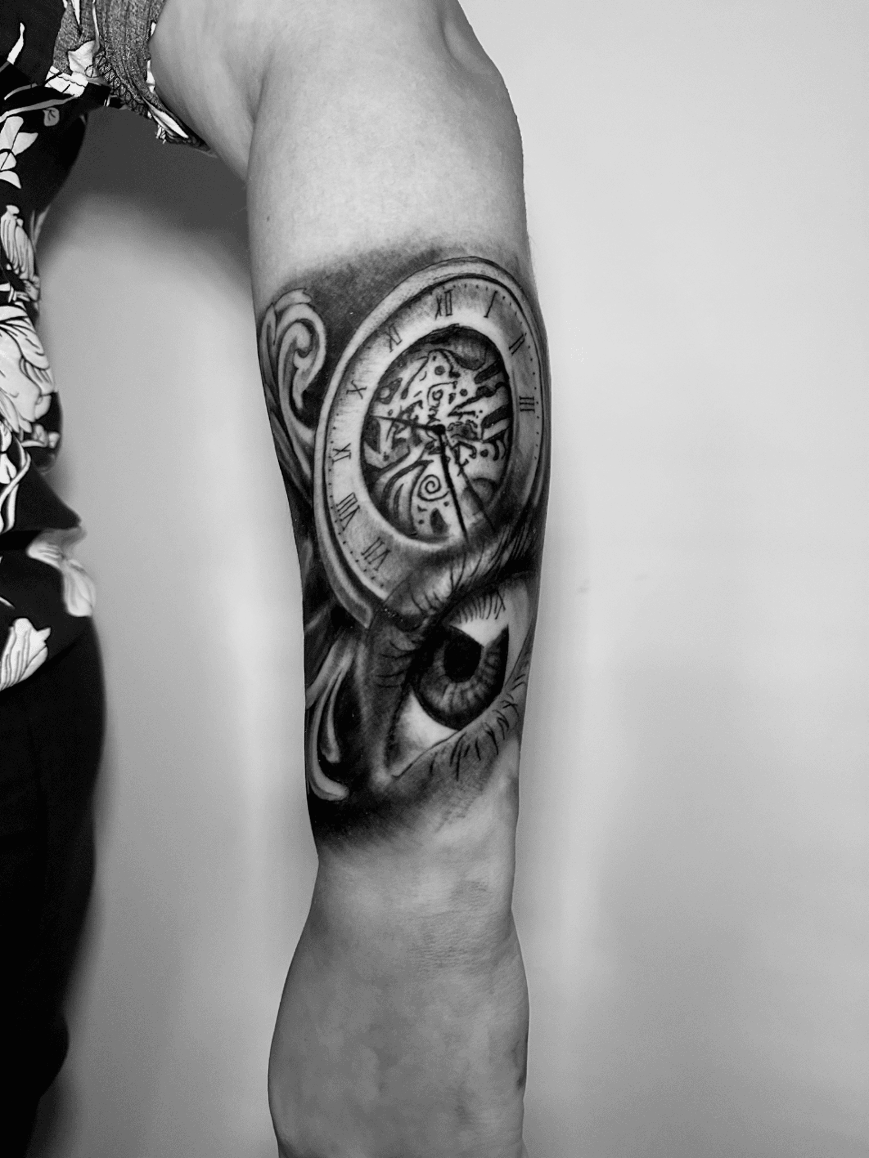 Realistic black and gray tattoo of eye and clock , by Gabriele Lacerenza