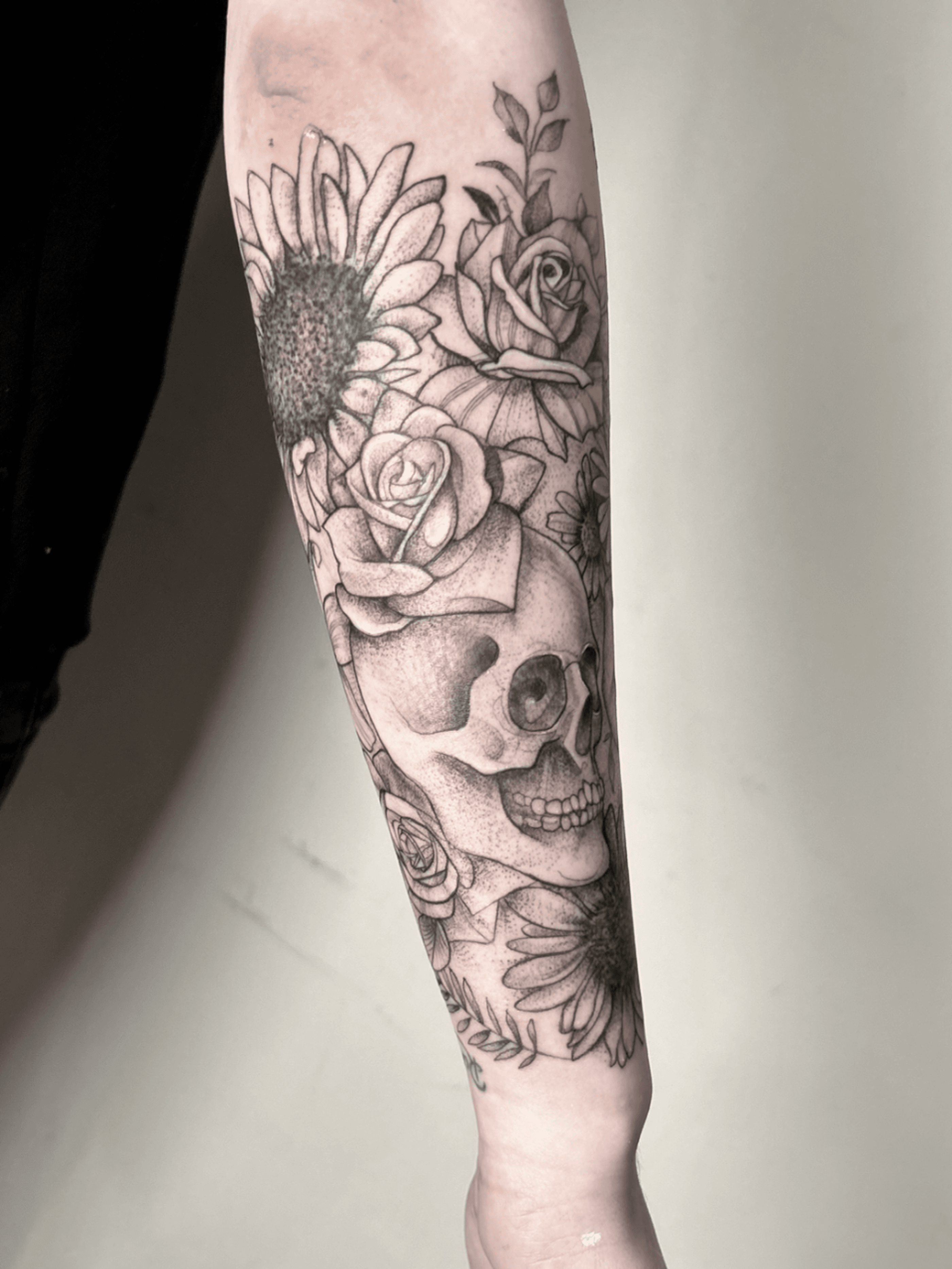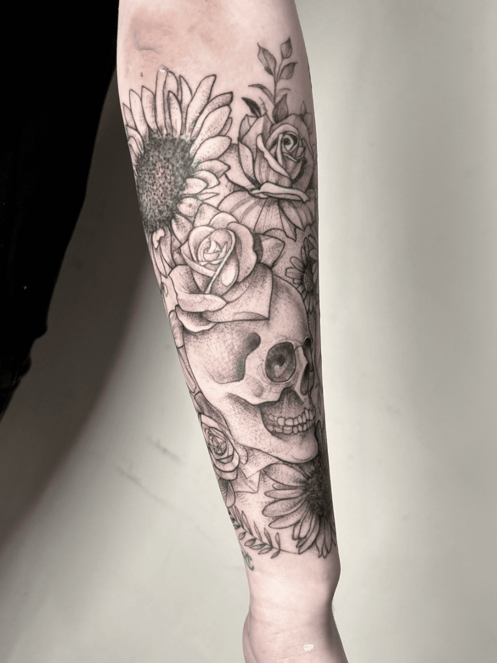 A detailed tattoo with a skull surrounded by a variety of flowers including sunflowers, roses, and others. The style is realistic.