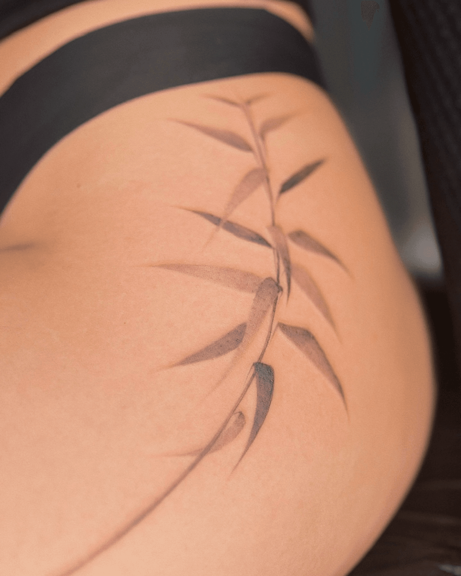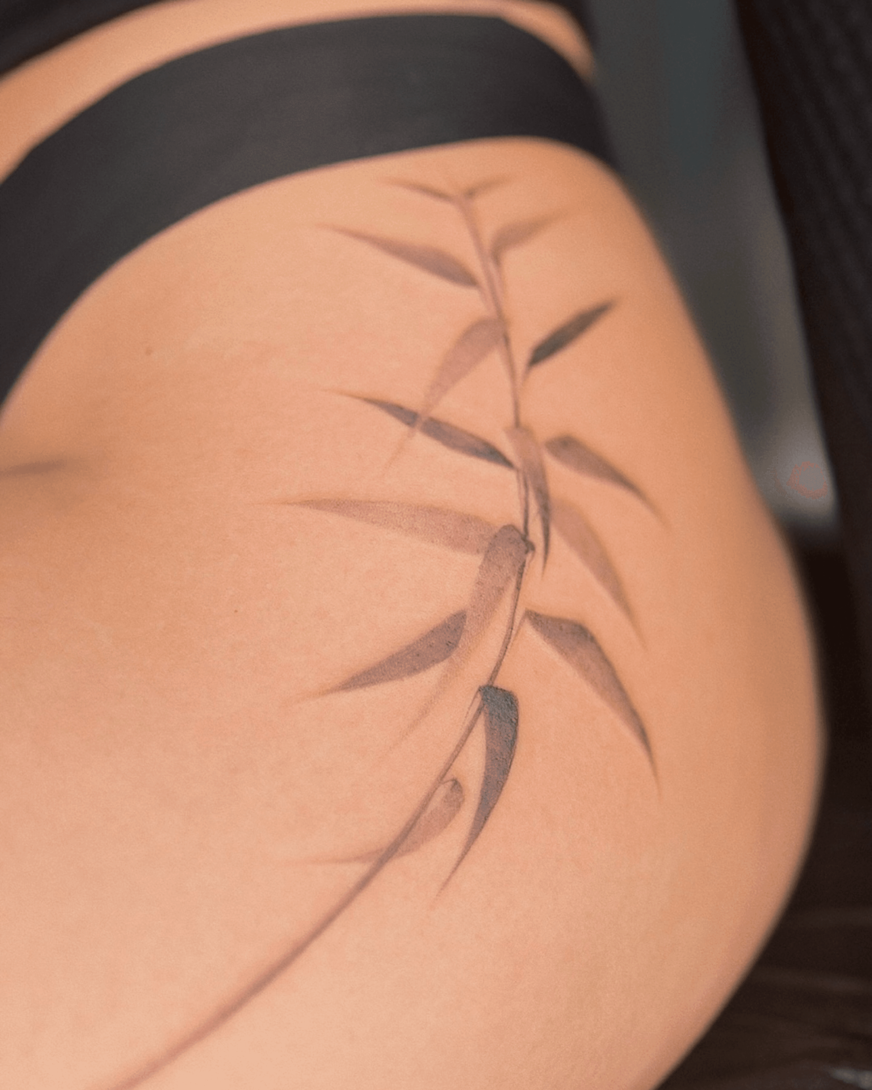 A tattoo of a bamboo plant, done with a watercolor style. The style utilizes a soft, diffused approach, and the leaves are shaded to create a three-dimensional effect. The tattoo has a calm and natural feel.