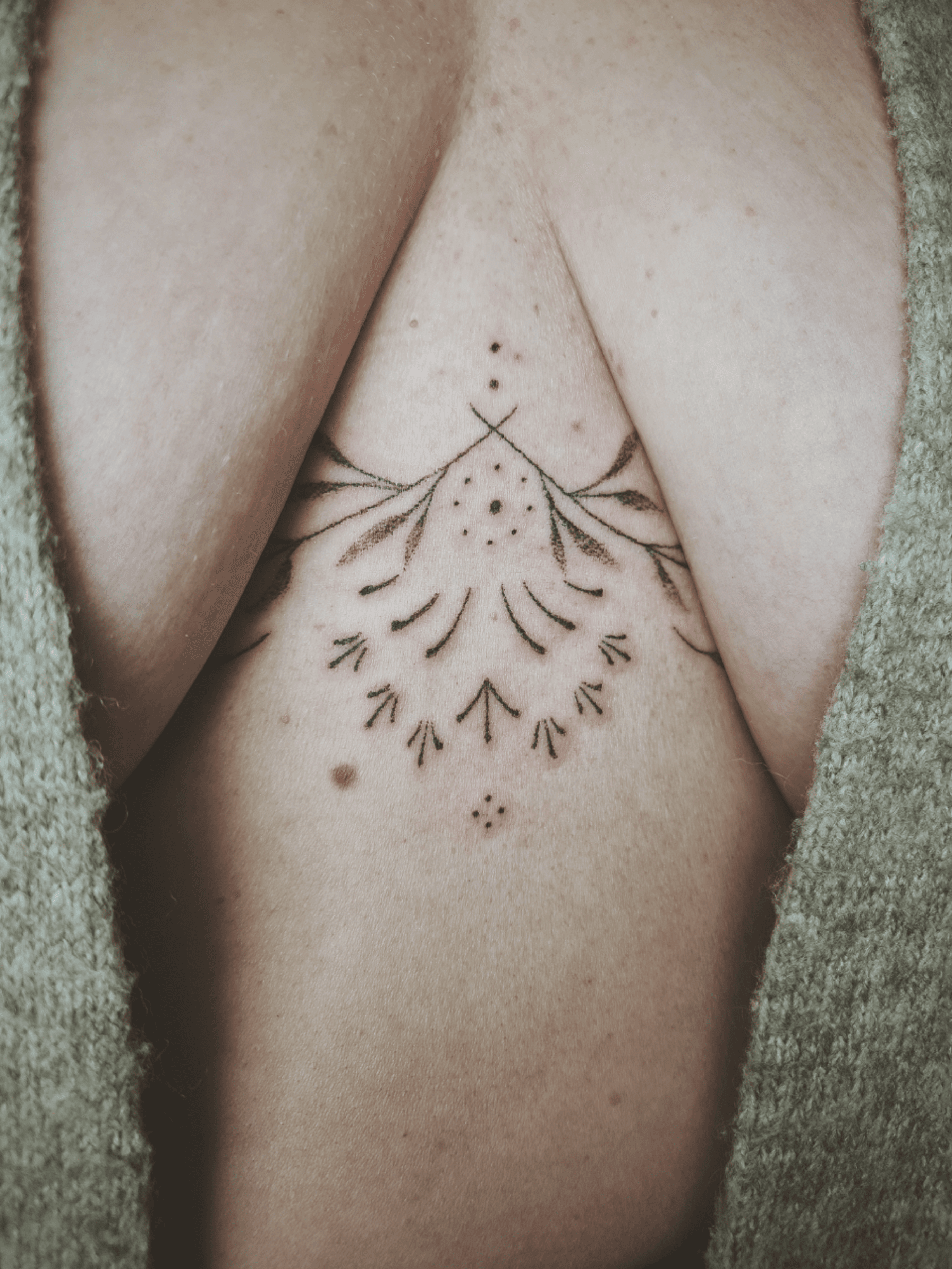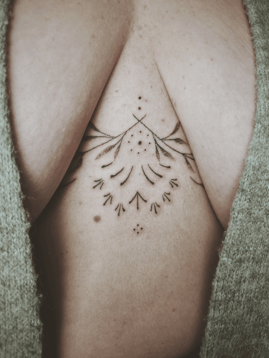 A linear design runs across the chest area. It consists of a symmetrical pattern with several dots and branch-like elements, the design gives a delicate aesthetic.