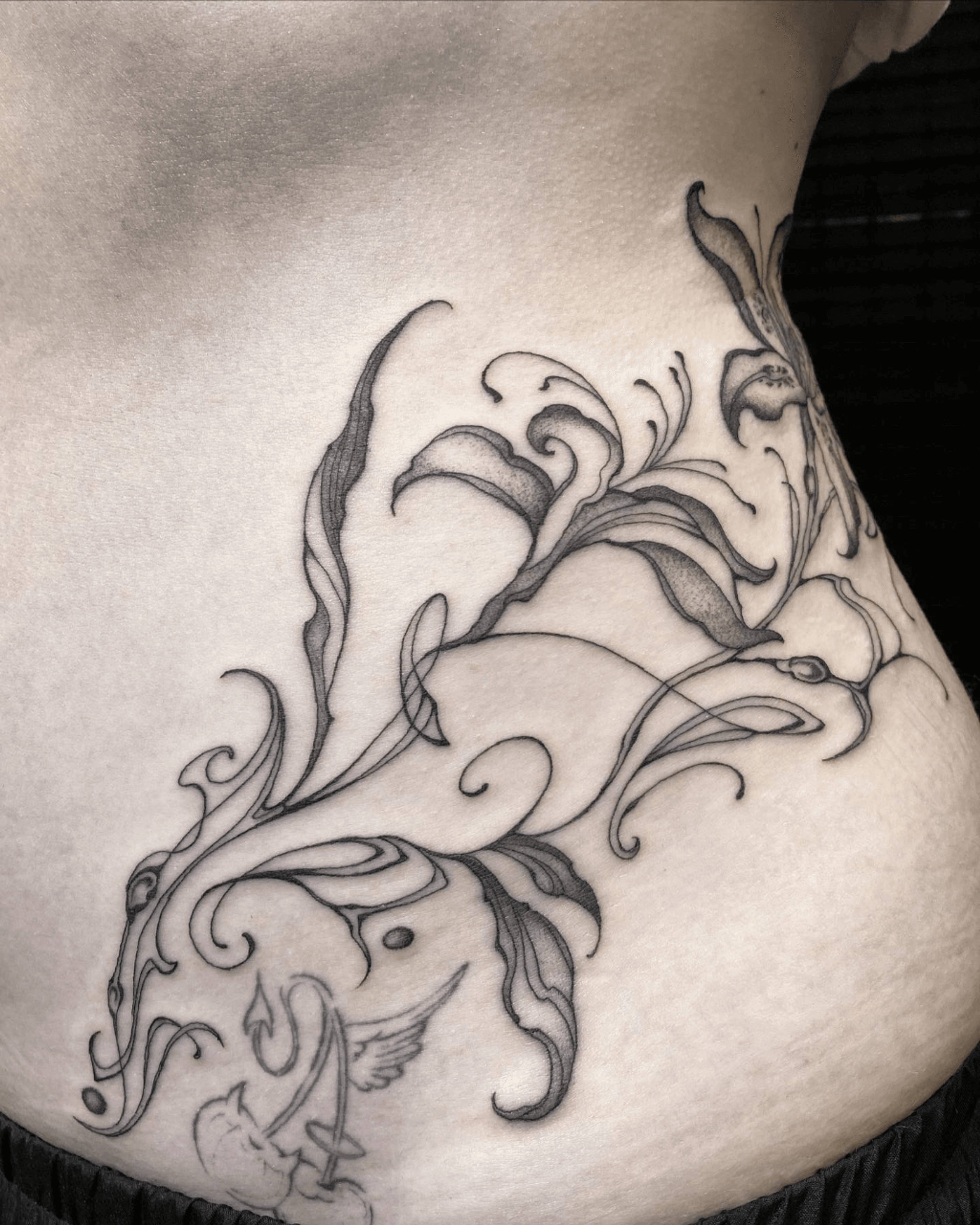 The tattoo features a stylized floral design with intricate line work and shading. The style is elegant, with a flowing feel.
