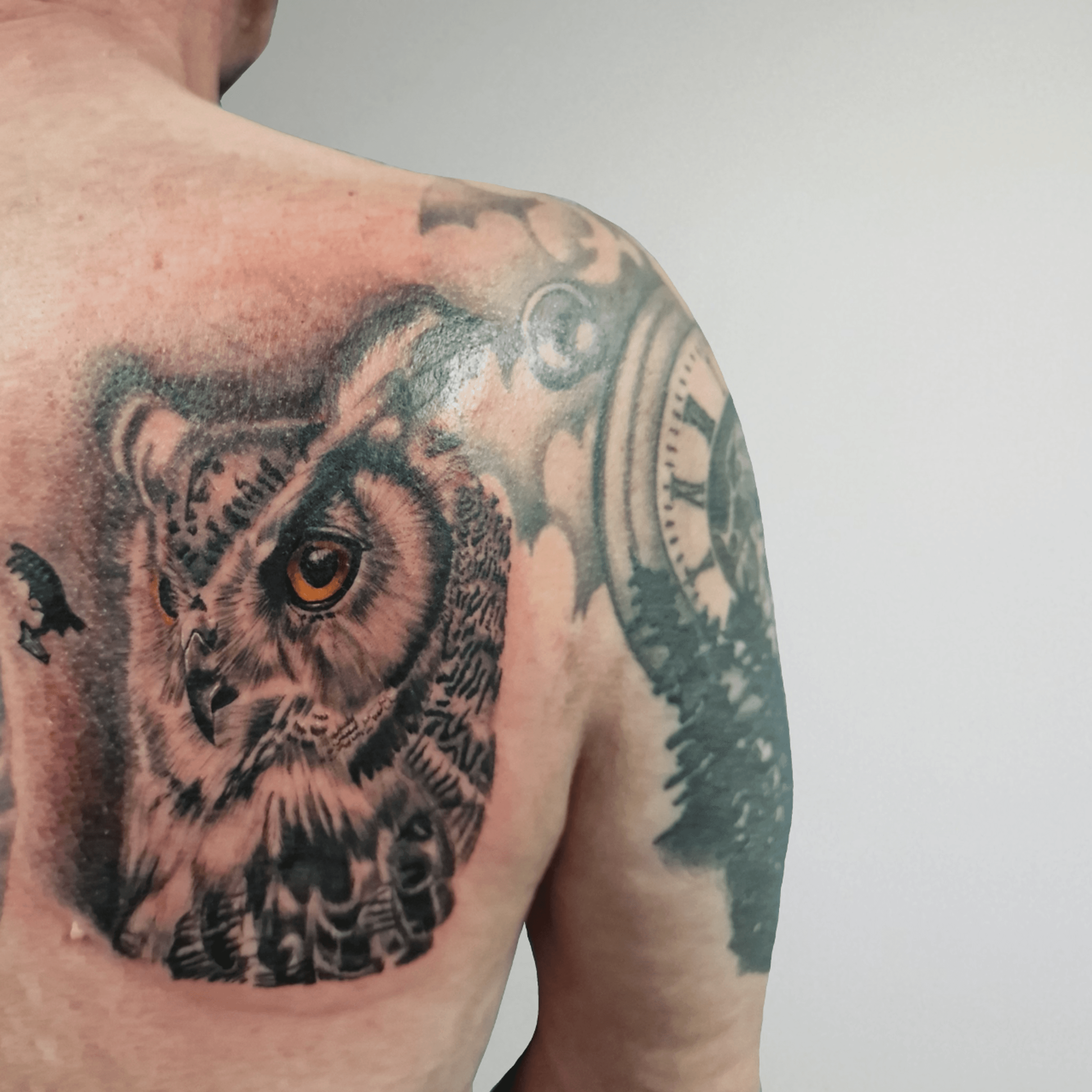This tattoo features a detailed owl portrait in a realistic style. The owl has striking orange eyes and is rendered with meticulous shading to create depth and texture. Surrounding the owl is a dark, atmospheric background with a forest that completes the design