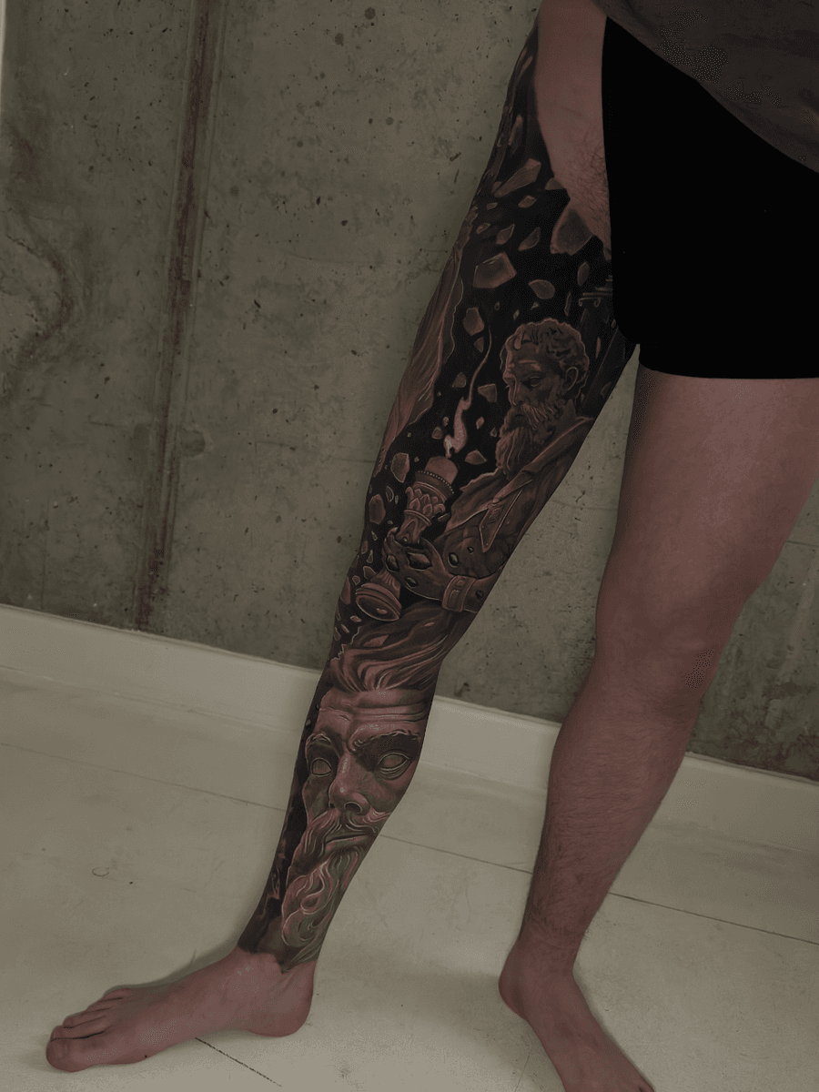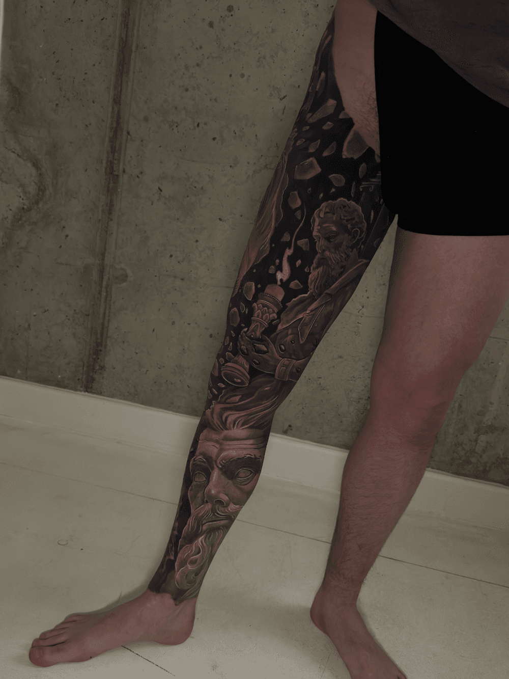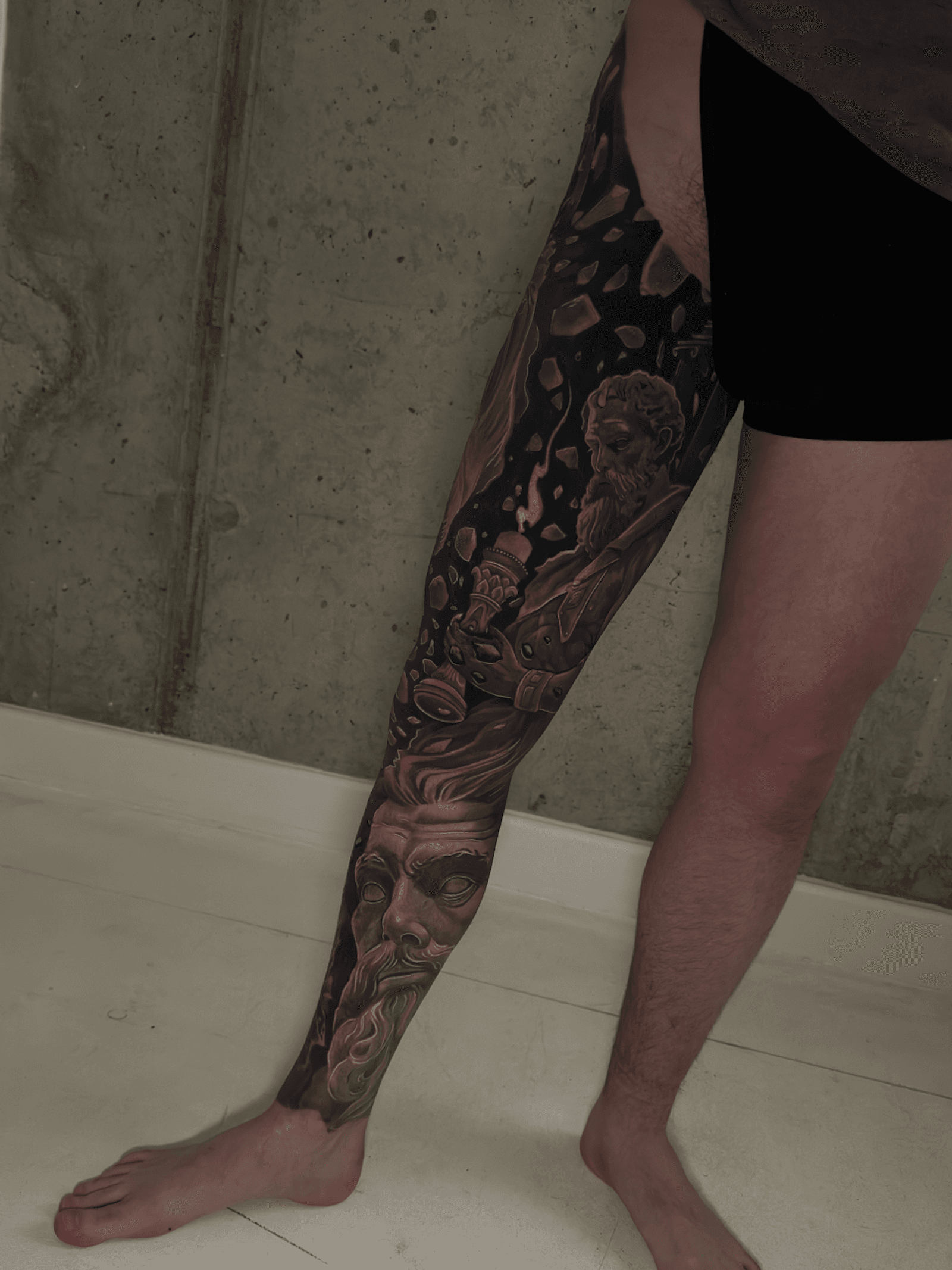 classic sculpture inspired to greek and roman mythology culture full leg black and grey tattoo realistic and surrealistic