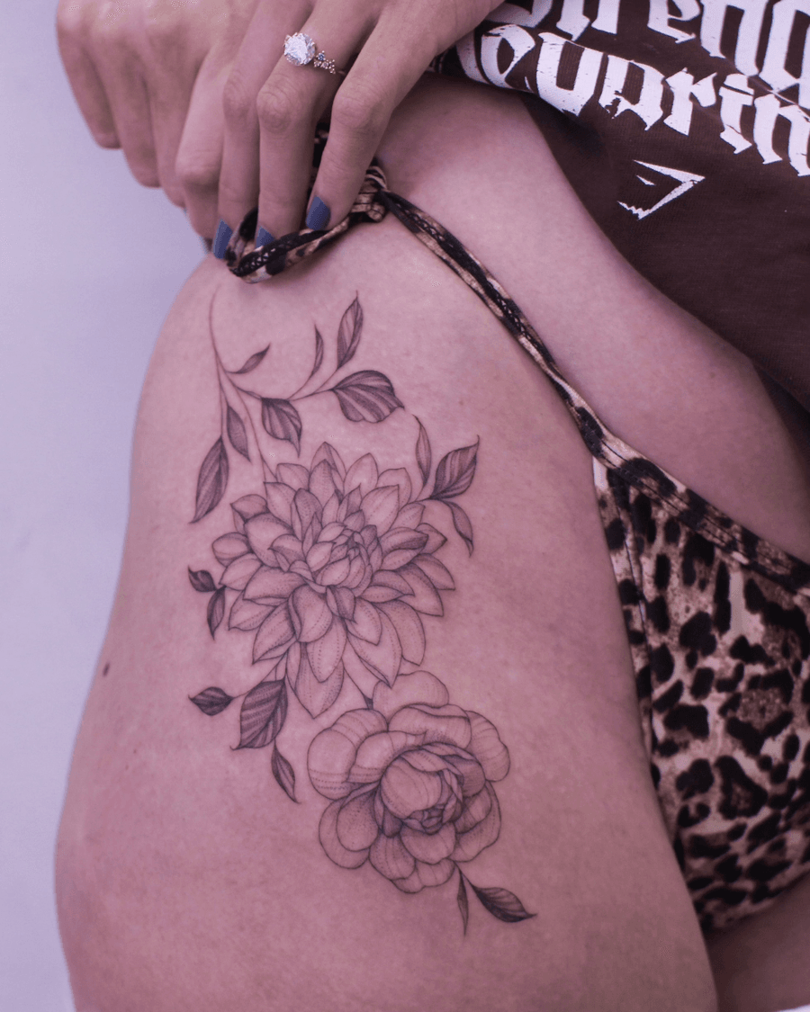 A delicate fine-line hip tattoo featuring a dahlia and a peony surrounded by graceful leaves and swirling vines. Elegant flattering sexy and elegant floral composition on the hip.