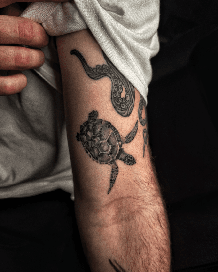 A black and gray tattoo featuring a detailed sea turtle, with an octopus tentacle partially visible above it, suggesting an underwater scene.