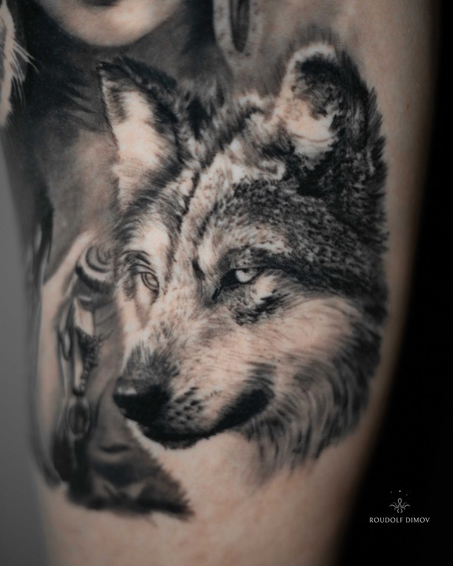 Black and grey realism tattoo of a wolf, symbolizing loyalty, instinct, and resilience. Detailed texture and soft shading create depth and expression. Tattooed by London artist Roudolf Dimov, known for lifelike animal realism and symbolic compositions.