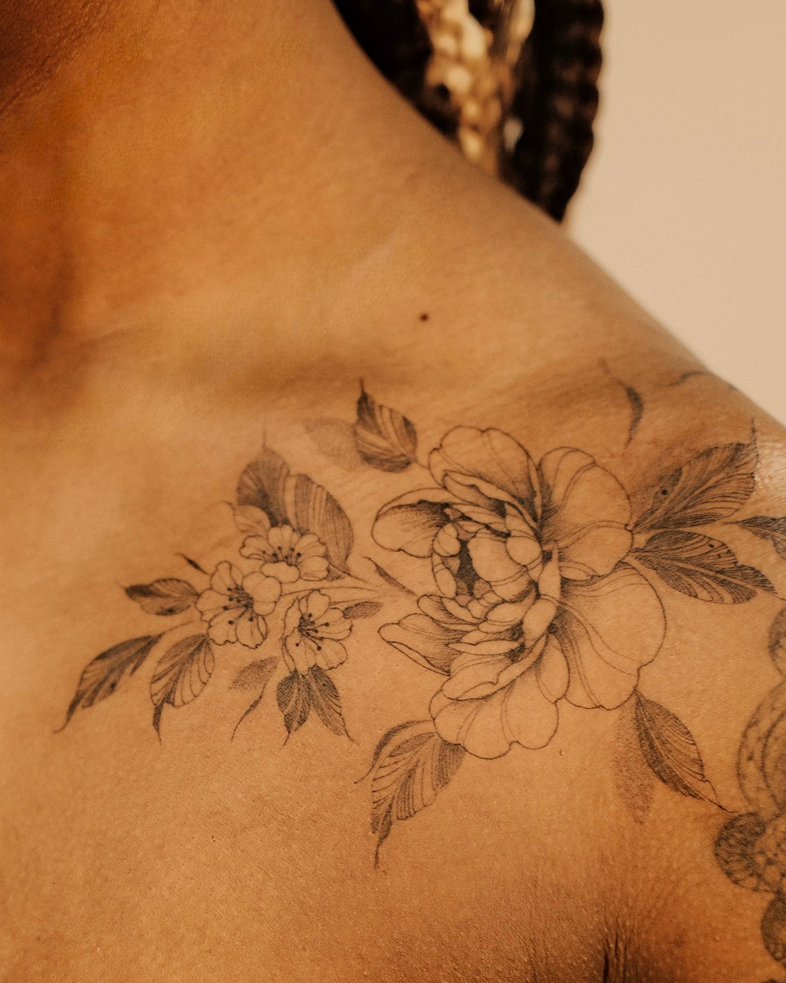 Delicate cherry blossoms and peony flowers in black and grey, made with the freehand method, flowing seamlessly on the arm, shoulder and collar bone, made on the darker skin tone, floral gap filler