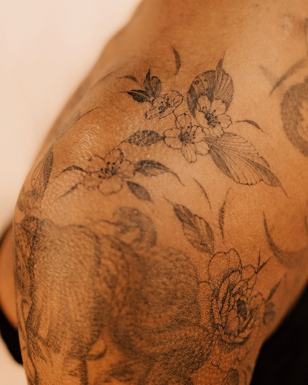 Delicate cherry blossoms and peony flowers in black and grey, made with the freehand method, flowing seamlessly on the arm, shoulder and collar bone, made on the darker skin tone, floral gap filler