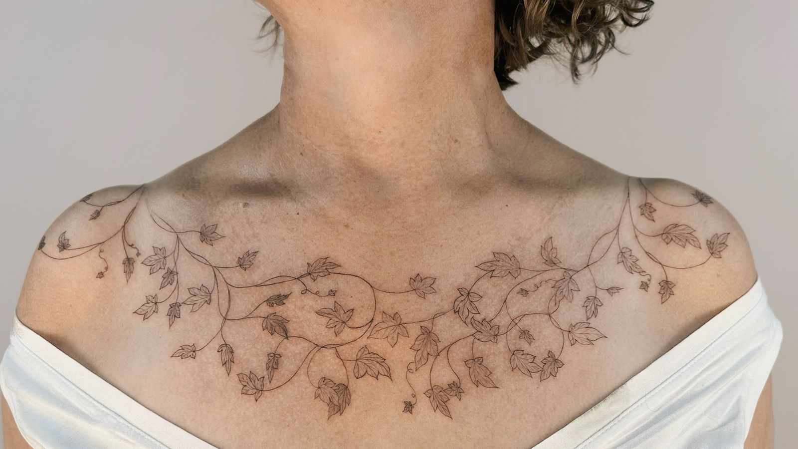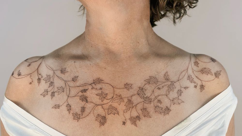 Delicate fine-line ivy leaves flowing on the shoulders, chest and collarbones, made with a freehand method