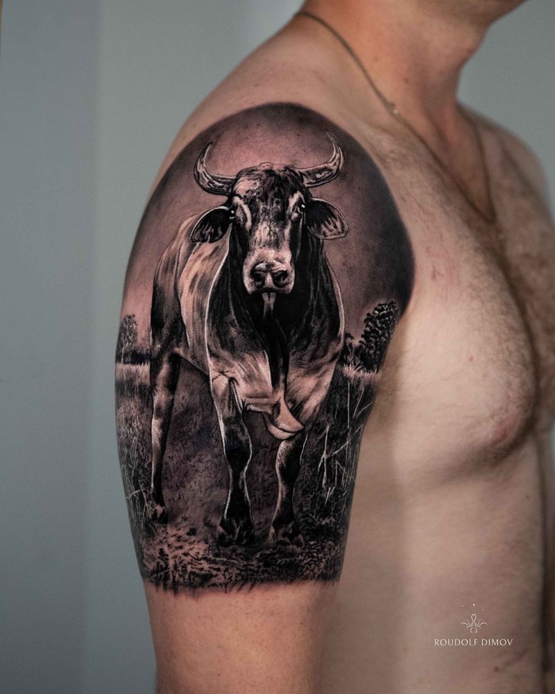 A powerful black and grey realism bull tattoo, representing strength, resilience, and unwavering presence. The composition focuses on anatomical accuracy, textured skin, and controlled contrast, giving the bull a grounded, commanding stance within its natural environment.