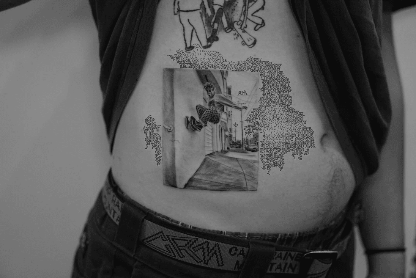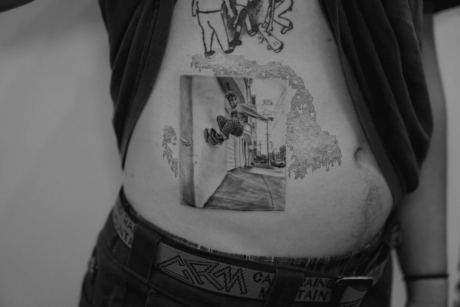 nothing like a vintage skate photograph tattoo . . . . #tattoo #tattoos #tattooartist #blacktattoo #blackandgreytattoo #microtattoo #skateboard #skate