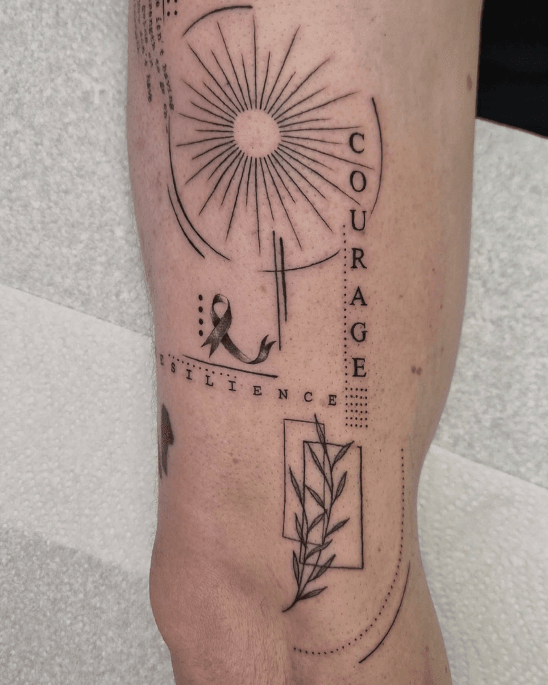 This micro-collage concept tattoo features script and delicate fineline details. This design combines Micro realism with fine line geometric imagery to create a modern aesthetic.