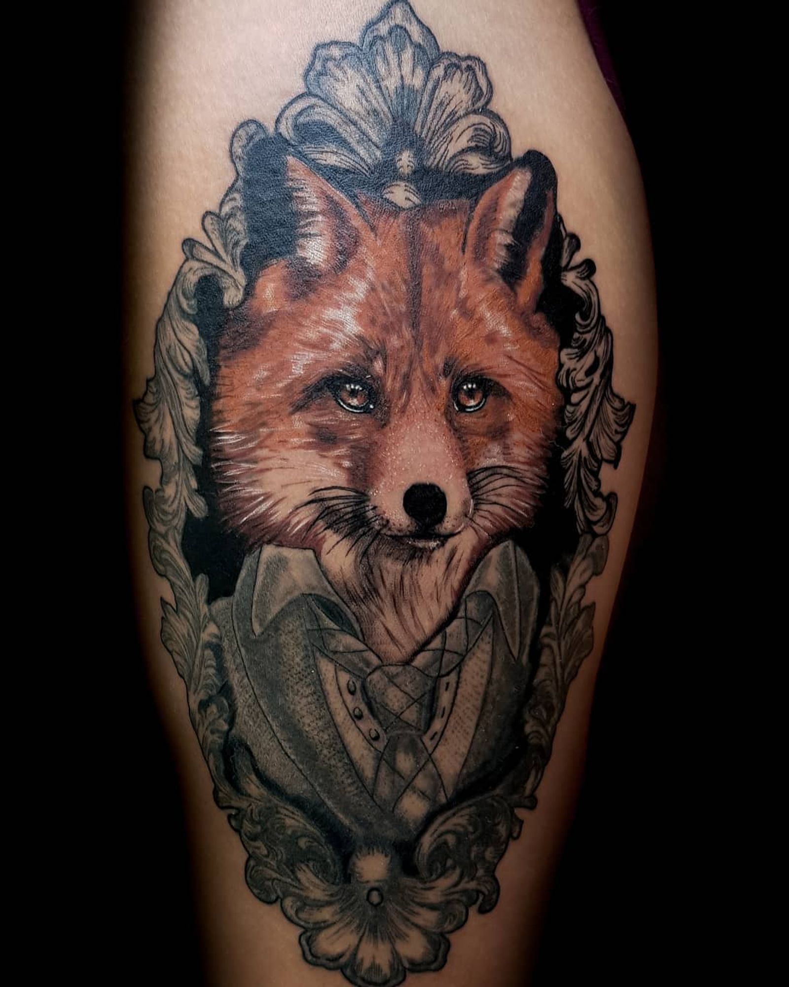 🦊Half healed half fresh🦊 Finally got some time to finish my sister's tattoo. #tattoofox #foxtattoo #tattoos #tattoo #fox #foxyeyes #colortattoo #radiantink #foxorange #manchestertattoo #tattoosonblackskin