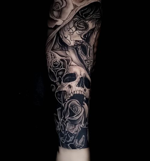 The actual tattoo and the design 😊. Love this one 🥰 #deadofthedaytattoos #katrinatattoo #skulltattoo