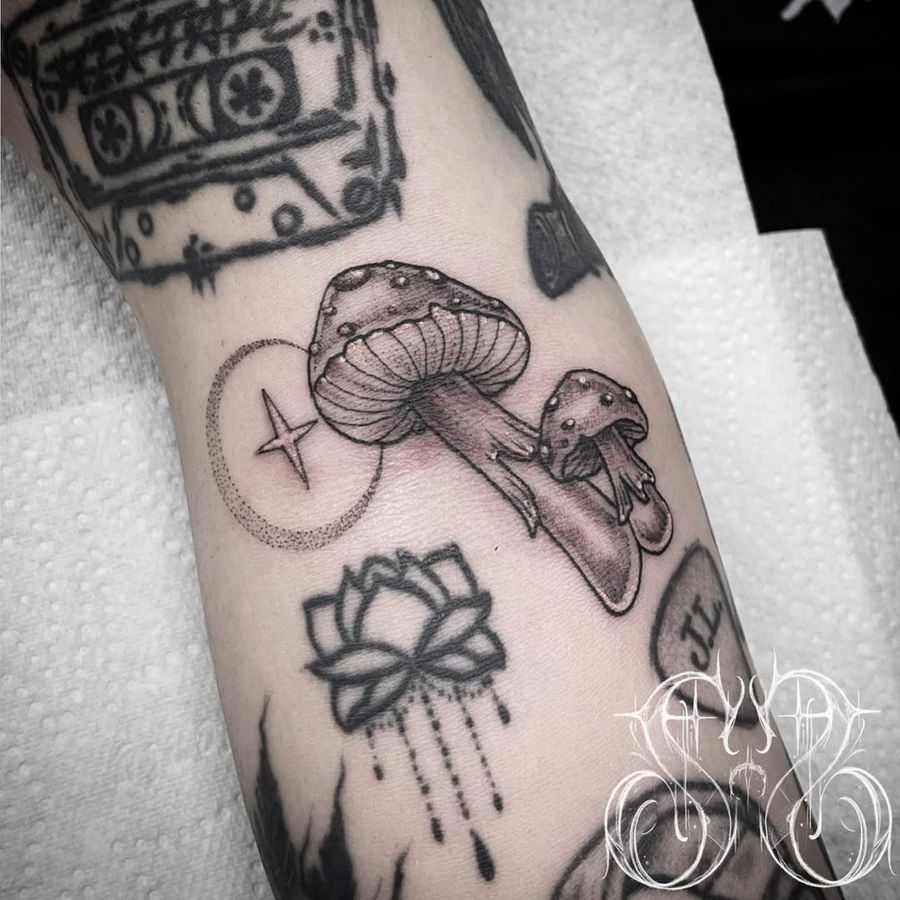 Mushroom gap filler for @awnyaa_ - - - - - - - - - #mushroom#mushrooms#mushroomtattoo#mushroomtattoos#dotwork#dotworktattoo#dotworkers#blackandgrey#blackandgreytattoo#neotraditional#neotraditionaltattoo#neotraditionaltattoos