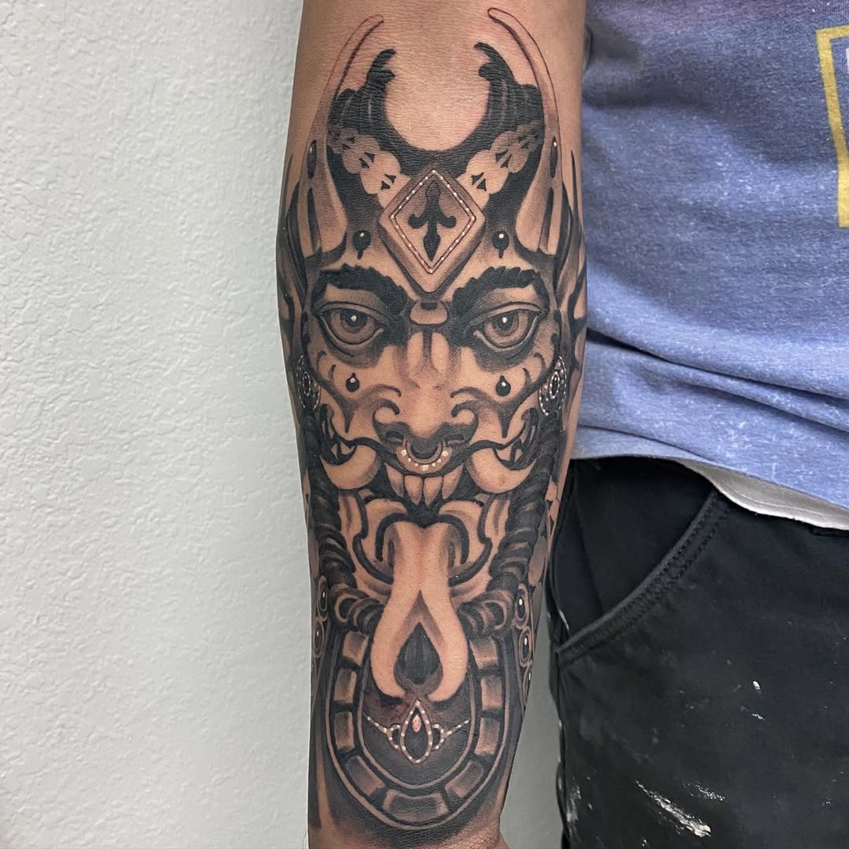 Demonic start to and angel and demon sleeve. Fun tattoo. More to come soon #demon#demontattoo#realistic#neotraditional#neotraditionaltattoo#angel#bngtattoo#bng#tattoos#tattoo#ikonikink#ikonikinktattoos