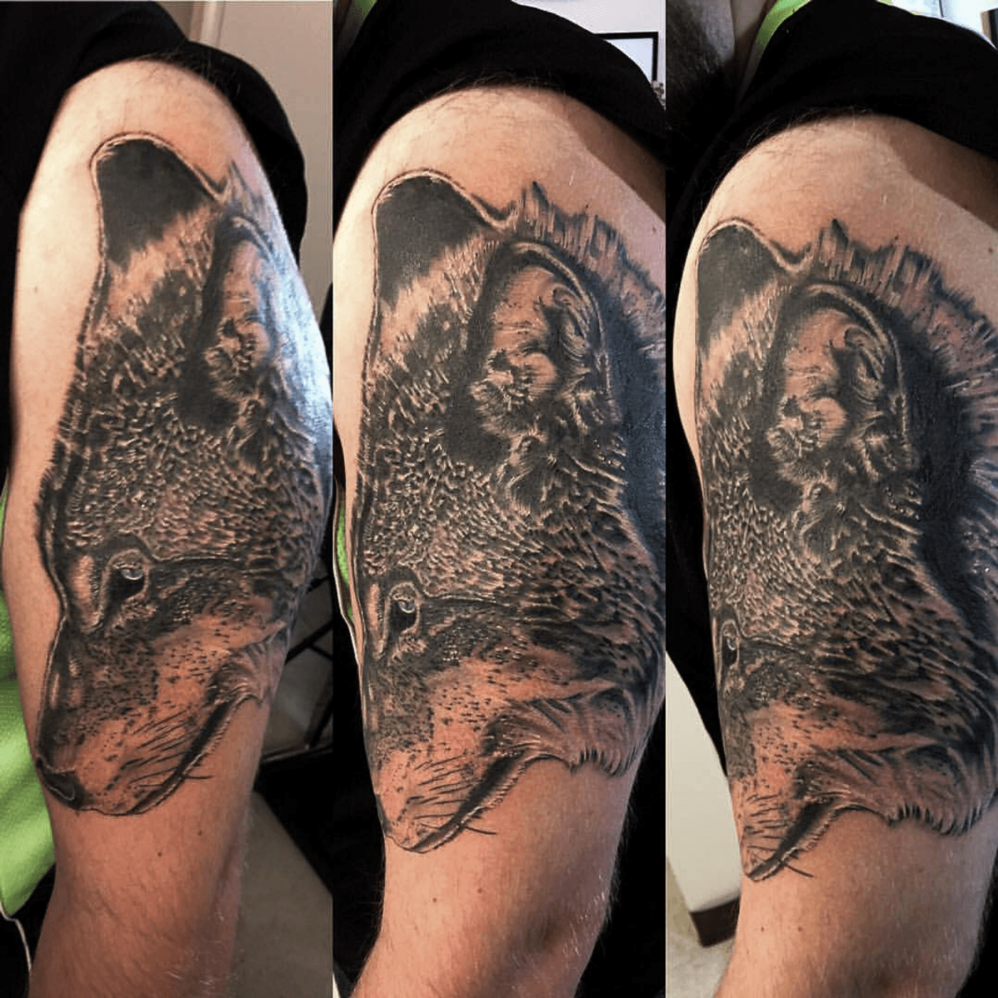Lil’ flashback to this wolf piece I did a few years ago. Super fun!! #wolf #wolftattoo #neversaydietattoo #hbgmade #hburgmade #tattoo #blackandgreytattoo