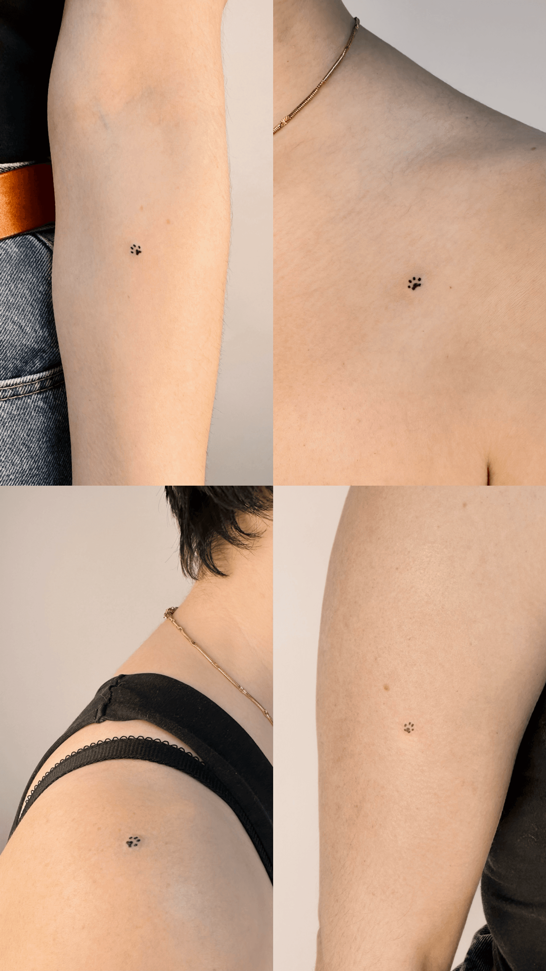 Minimalist fine-line tattoo of a tiny paw print made in dark brown ink, placed in different areas of the body (arm, collarbone, shoulder, and upper arm). The design is delicate, subtle, and discreet, with clean dotwork and a soft, minimal aesthetic.