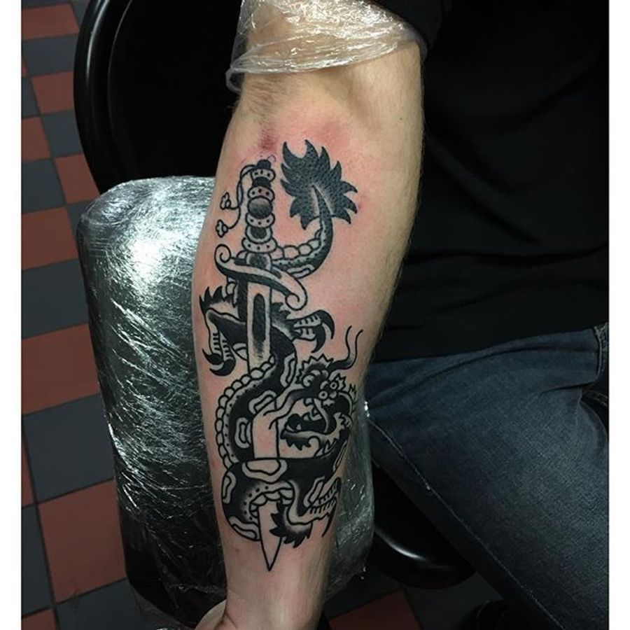 Dragon Tattoo by Sway Tattooer #blackworkdragon #blackwork #AmericanTraditional #traditionalblackwork #SwayTattooer