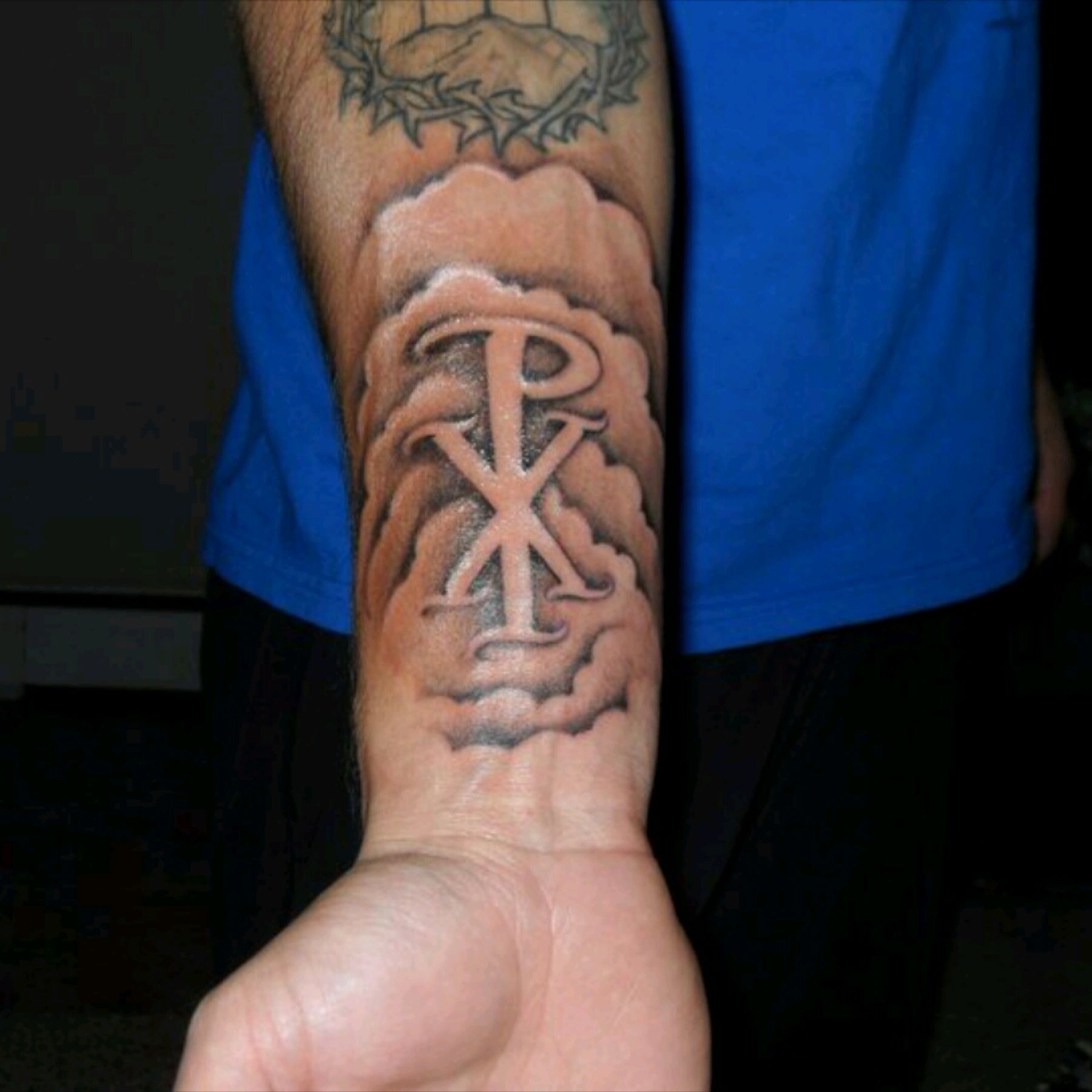 The Chi-Rho. Christian symbol. I wear it as a symbol of God's victory. It's a good conversation starter, although a lot of people think its a gang symbol, LOL