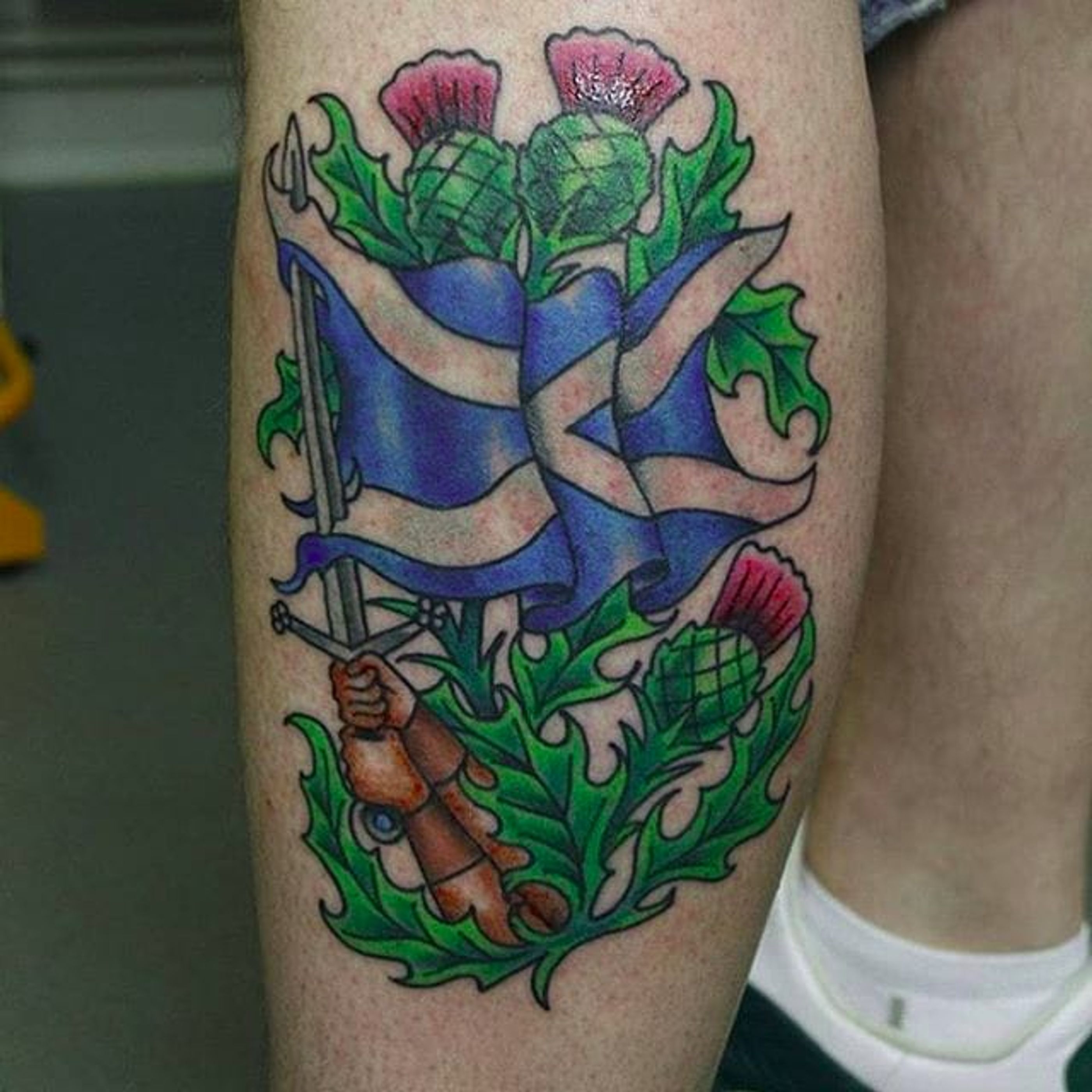 Scottish flag and flowers by by Darryl Mullen (via IG -- irezumitattooglasgow) #darrylmullen #scotland #scottishtattoo #scottishpridetattoo
