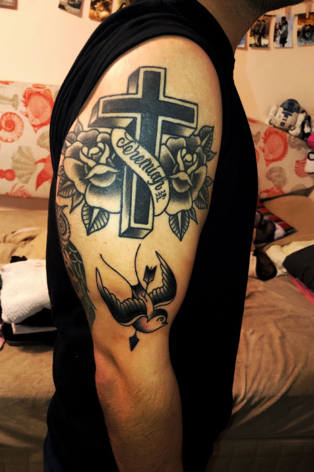 American traditional #swallow #owl #cross #roses #AmericanTraditional #blackandgrey #BW