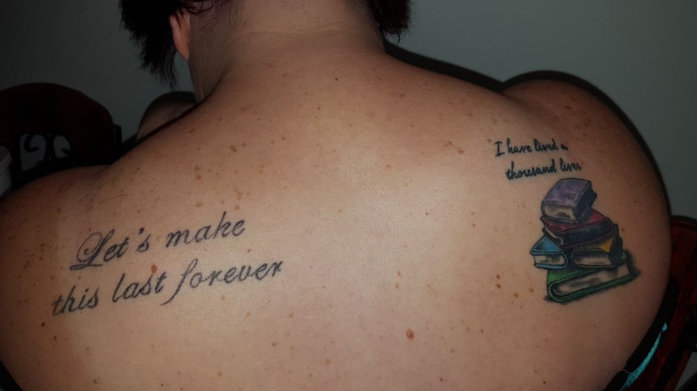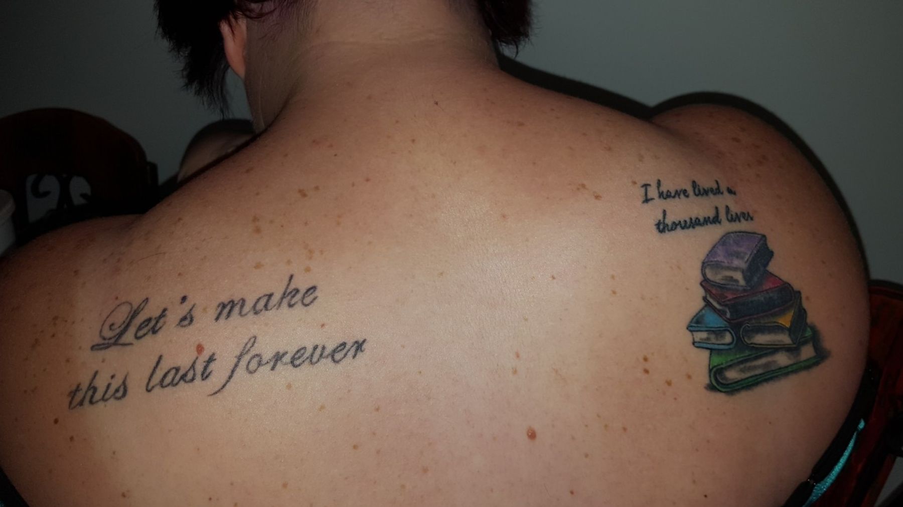 The left is from my favorite Blink182 song. The right says I have lived a thousand lives. It's a matching tattoo with my husband