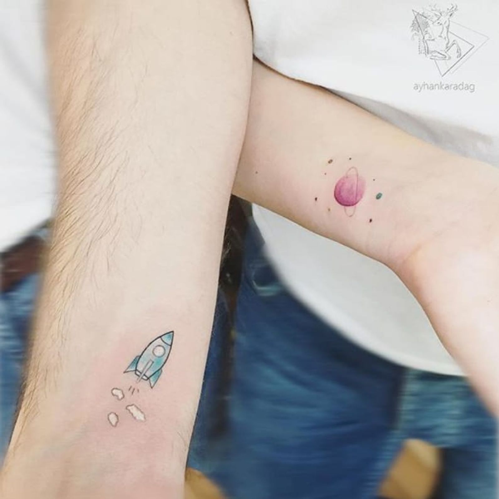 What are cooler than lovely couple tattoos?! Done by Ayhan Karadag at Ayhan Karadag Tattoo Studio #minimal #matchingtattoo #coupletattoo #rocket #planet #ayhankaradag