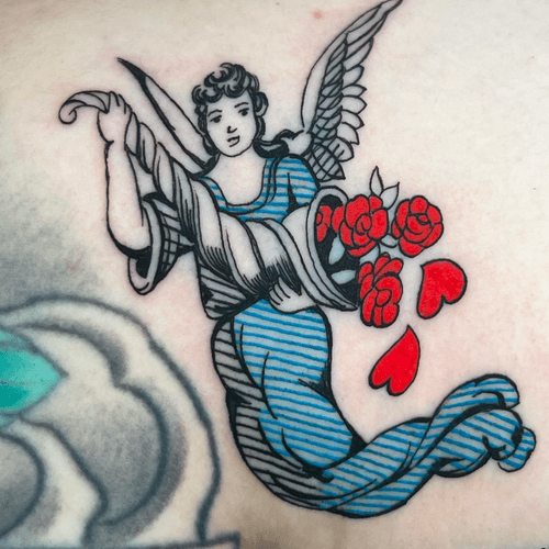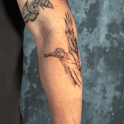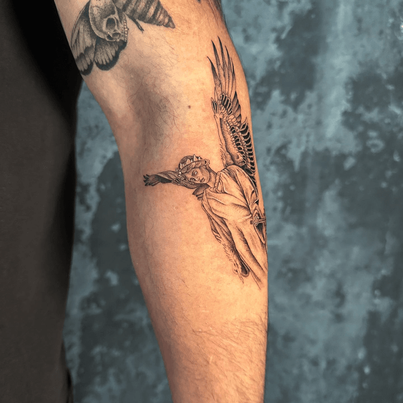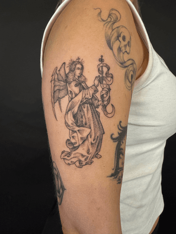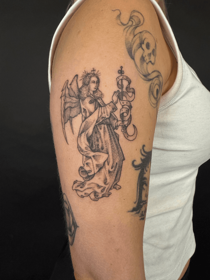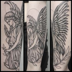 Angelic tattoo art featuring guardian angels, cherubs, angel wings, and fallen angel designs. Explore religious, classical, and contemporary angel tattoo styles.