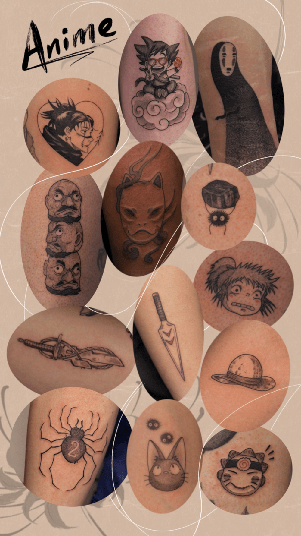 Anime and manga inspired tattoo designs featuring characters, scenes, and art styles from Japanese animation. Browse Naruto, One Piece, Dragon Ball, and Studio Ghibli inspired ink.