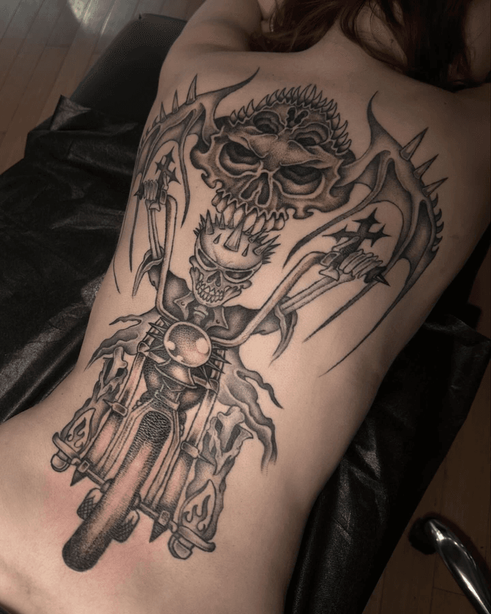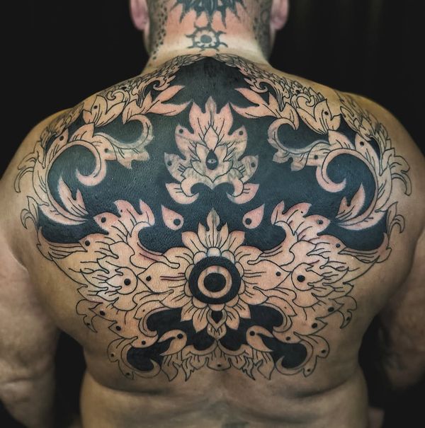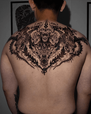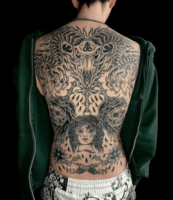 Large-scale back tattoo artwork including traditional Japanese back pieces, dragon back tattoos, biomechanical designs, and nature scenes. Browse full back tattoos, upper back designs, and lower back pieces in various styles.