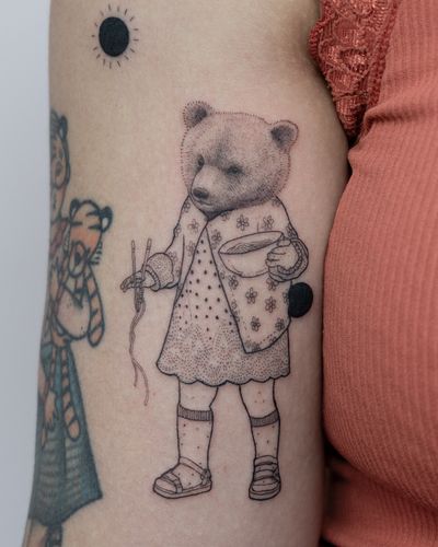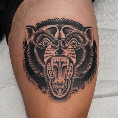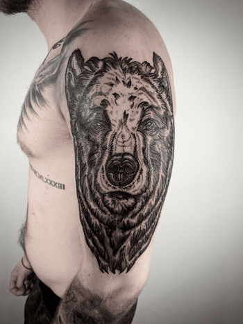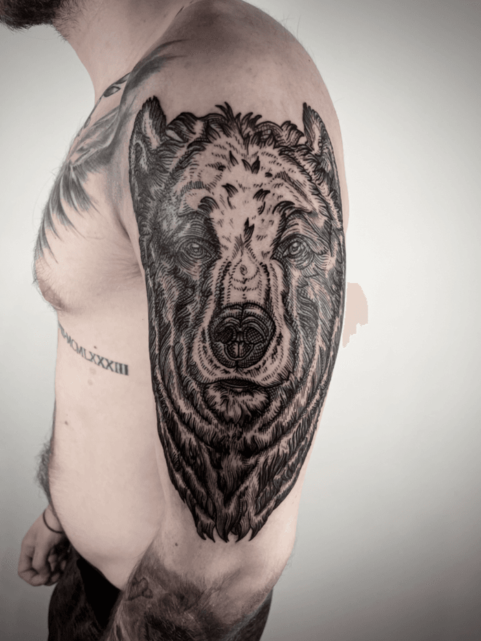Bear tattoo art featuring grizzly bears, polar bears, geometric bears, and traditional bear head designs. Explore realistic, neo-traditional, and illustrative bear artwork.
