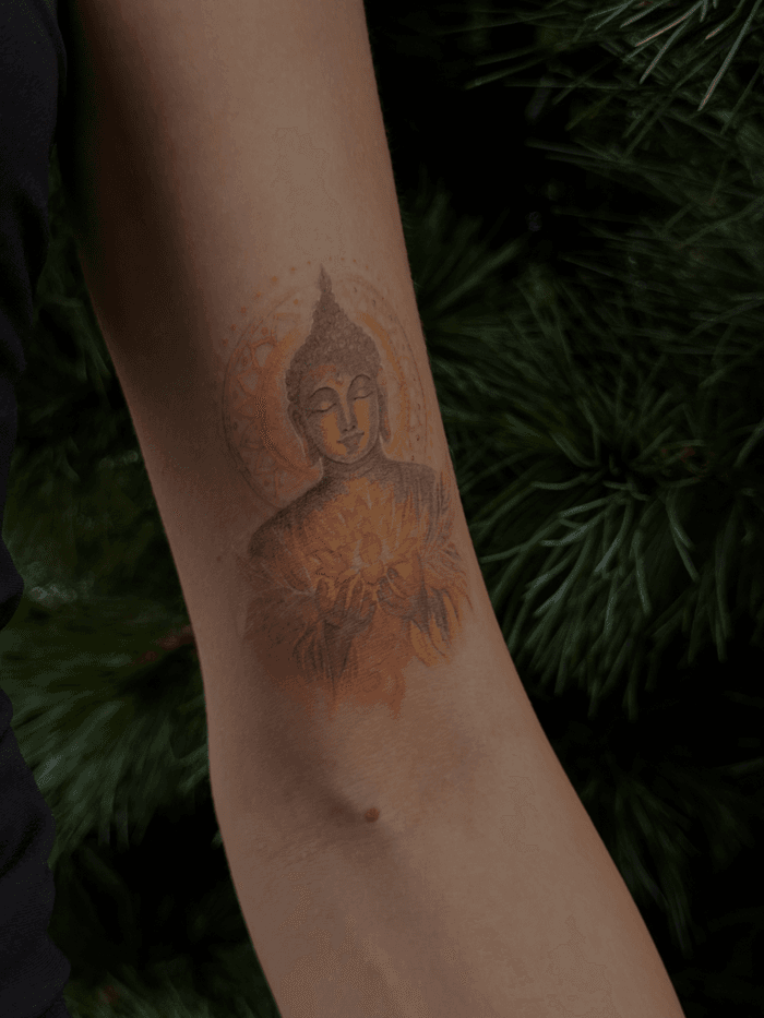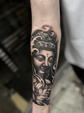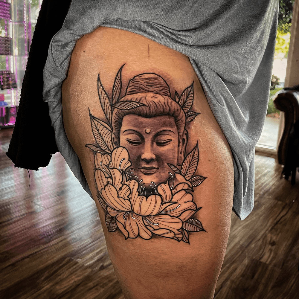 Buddha and Buddhist tattoo art featuring meditation poses, lotus thrones, dharma wheels, and enlightenment symbols. Explore traditional, realistic, and ornamental Buddha tattoo designs.
