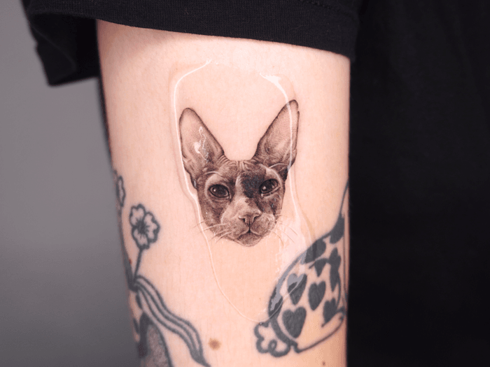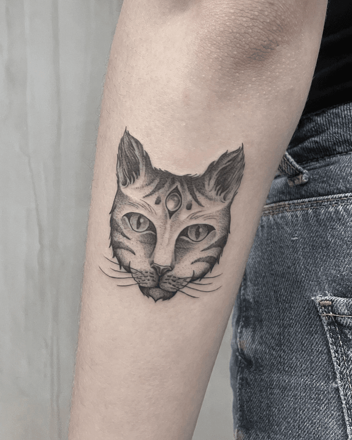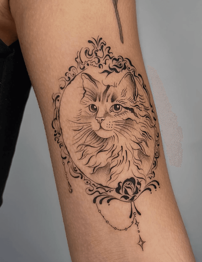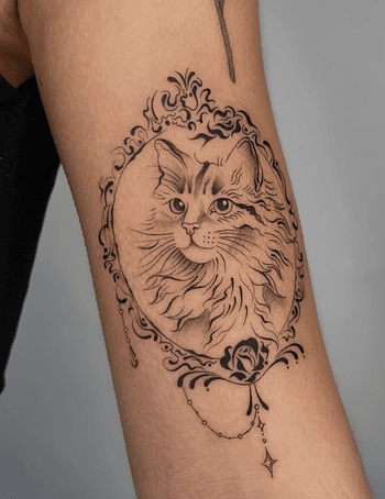 Cat tattoo art featuring realistic cat portraits, black cat silhouettes, traditional cat designs, and whimsical feline illustrations. Explore cute, dark, and elegant cat tattoo styles.