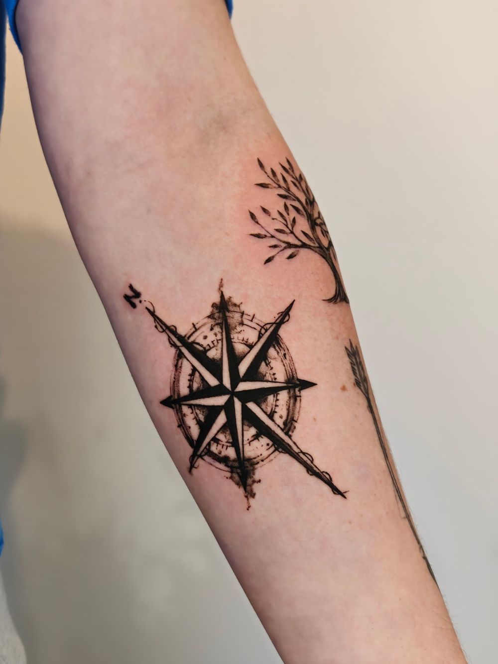Compass and navigation tattoo designs including nautical compasses, vintage maps, wanderlust themes, and explorer motifs. Browse traditional, realistic, and geometric compass artwork.