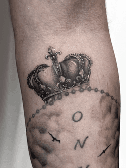 Crown tattoo art featuring royal crowns, king and queen designs, traditional crown motifs, and ornamental crown compositions. Explore classic and modern crown tattoo styles.