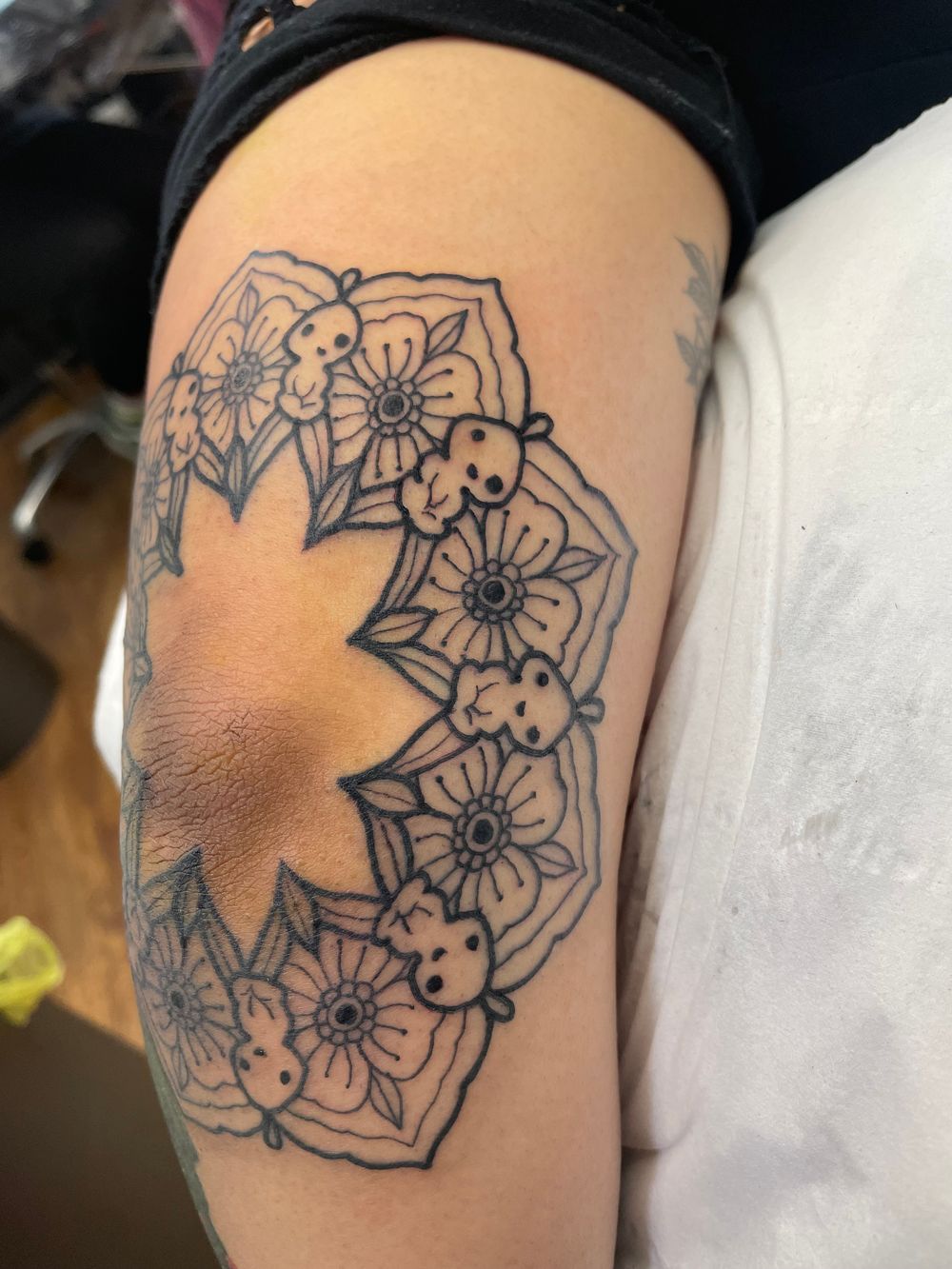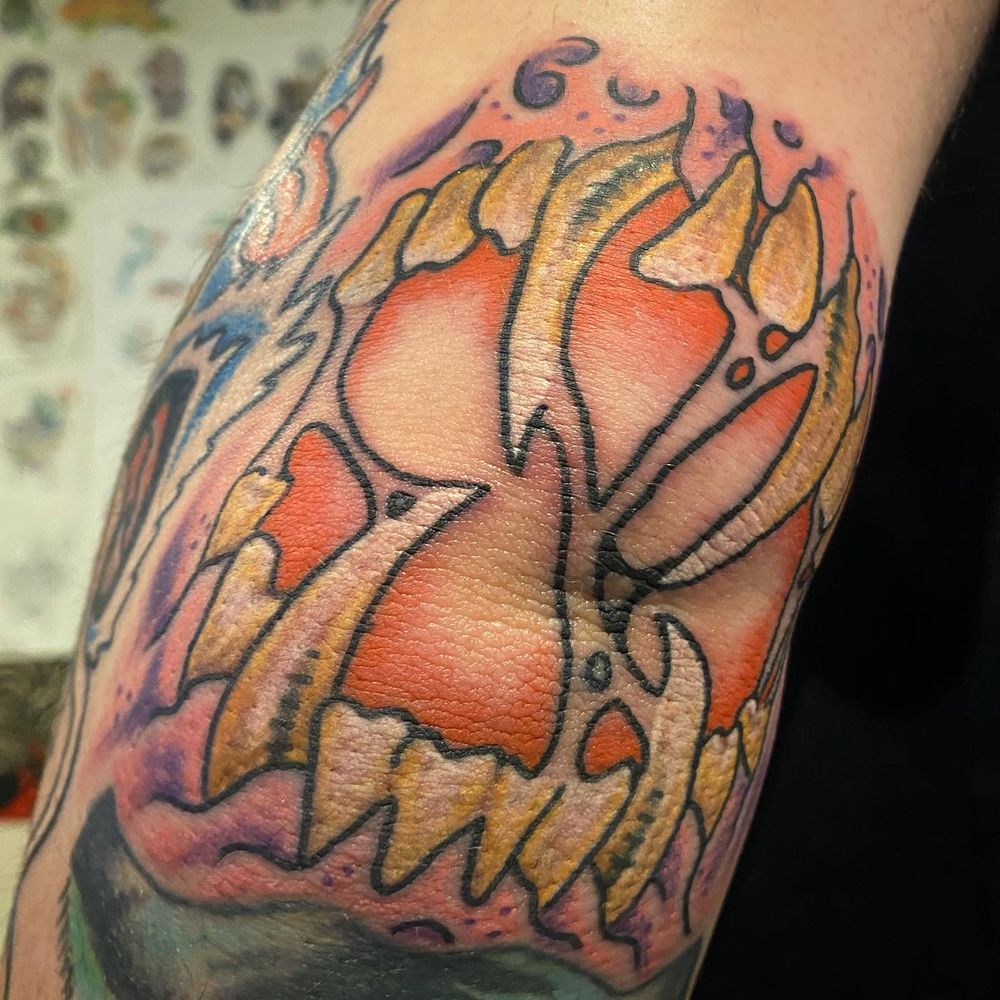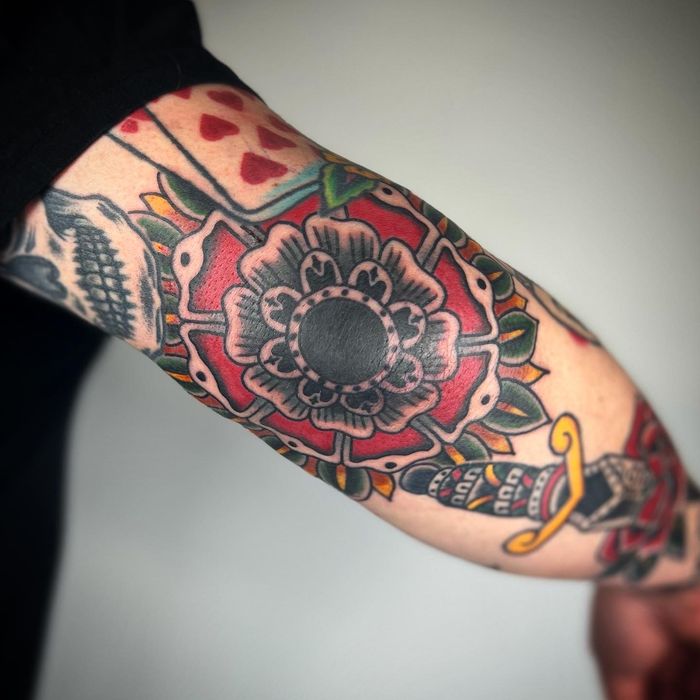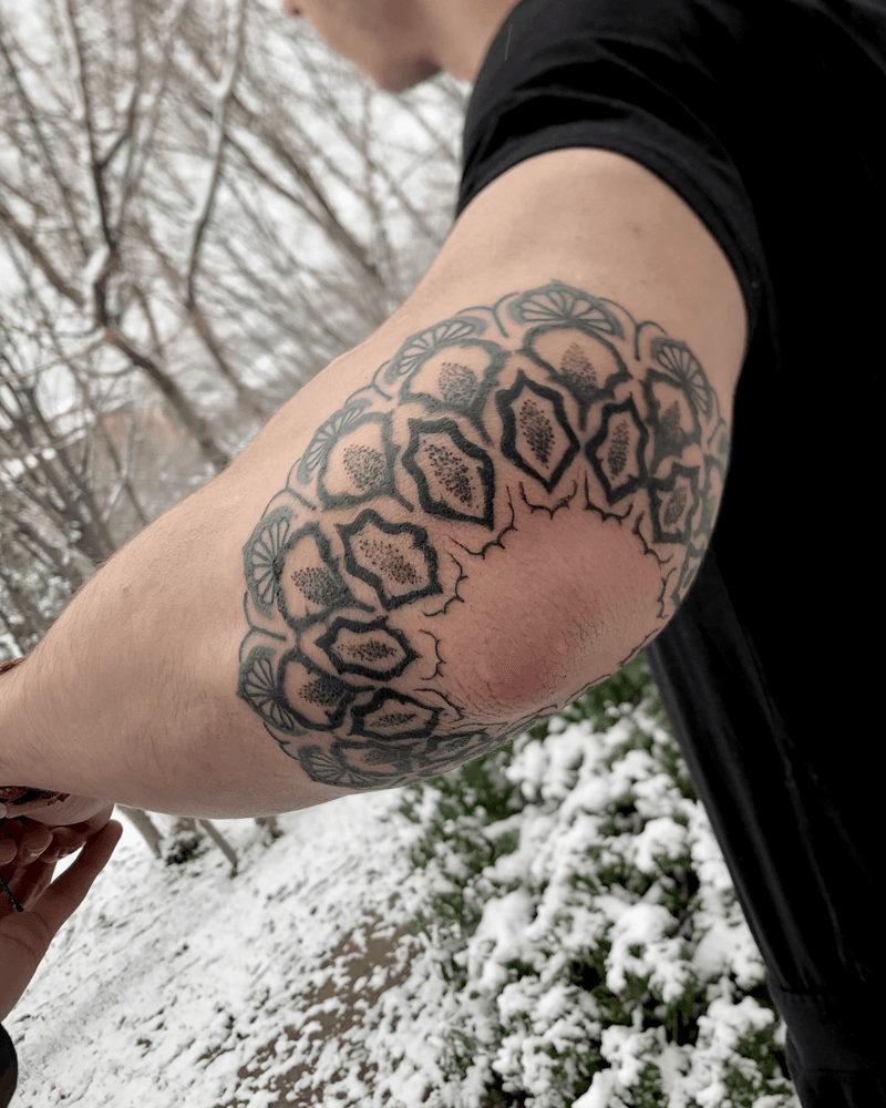 Striking elbow tattoo designs including spider webs, mandalas, roses, and geometric patterns. Explore inner elbow ditch tattoos and full elbow cap pieces.