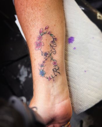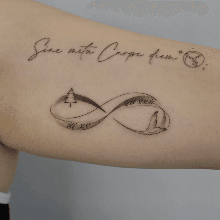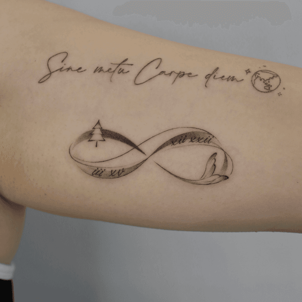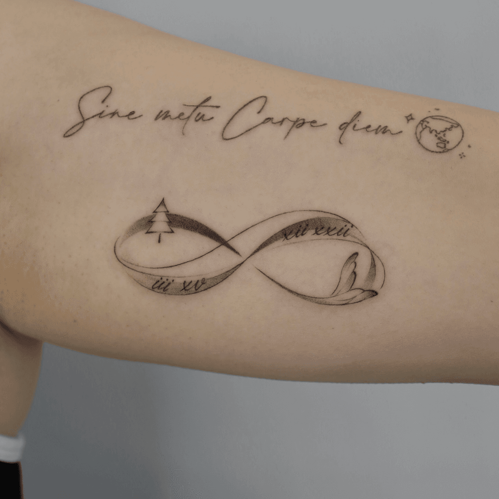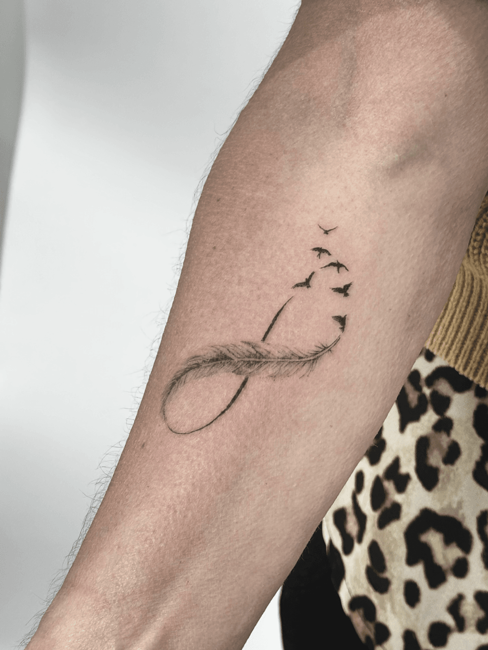 Infinity symbol tattoo designs featuring names, hearts, feathers, and creative variations on the eternal loop. Explore minimal, ornamental, and personalized infinity tattoo styles.