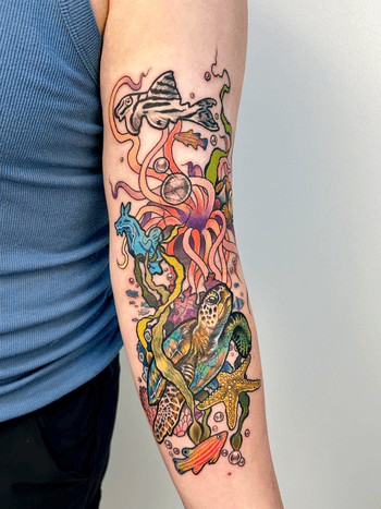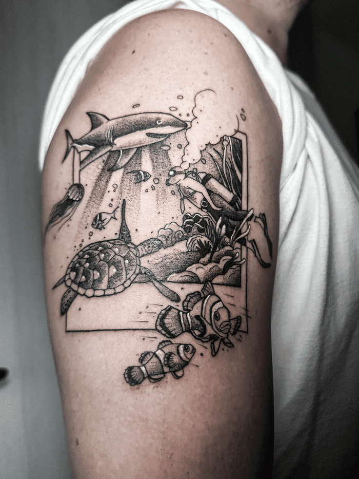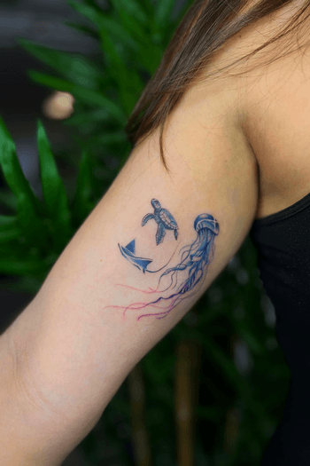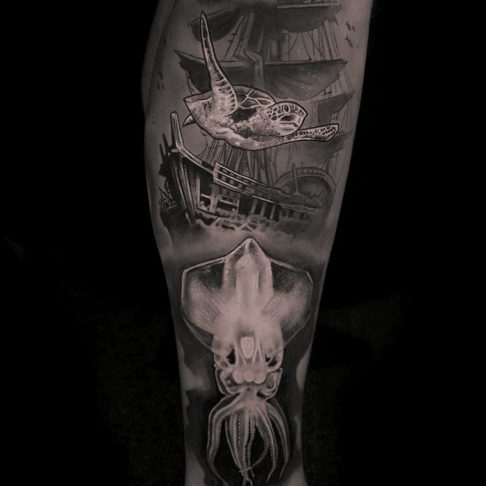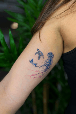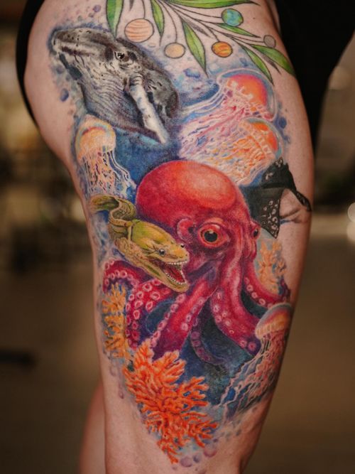 Aquatic tattoo designs featuring whales, sharks, octopus, jellyfish, and coral reef scenes. Discover realistic ocean life portraits, traditional nautical tattoos, and underwater themed pieces.