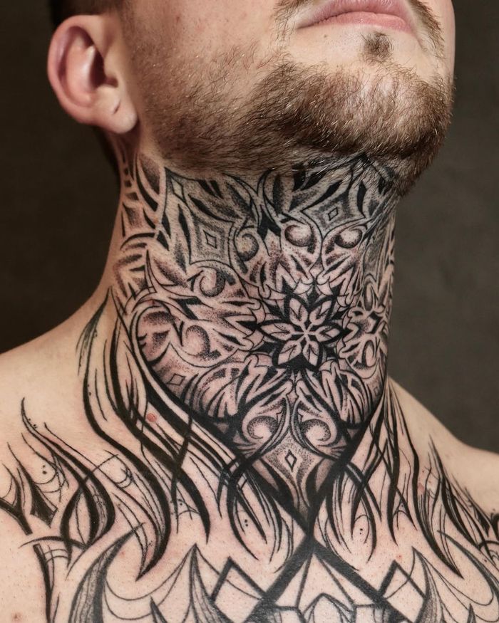 Neck tattoos placement including throat tattoos, side neck tattoos, back of neck tattoos, and nape tattoos. Find inspiration for both small and large neck piece designs.