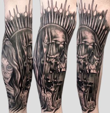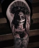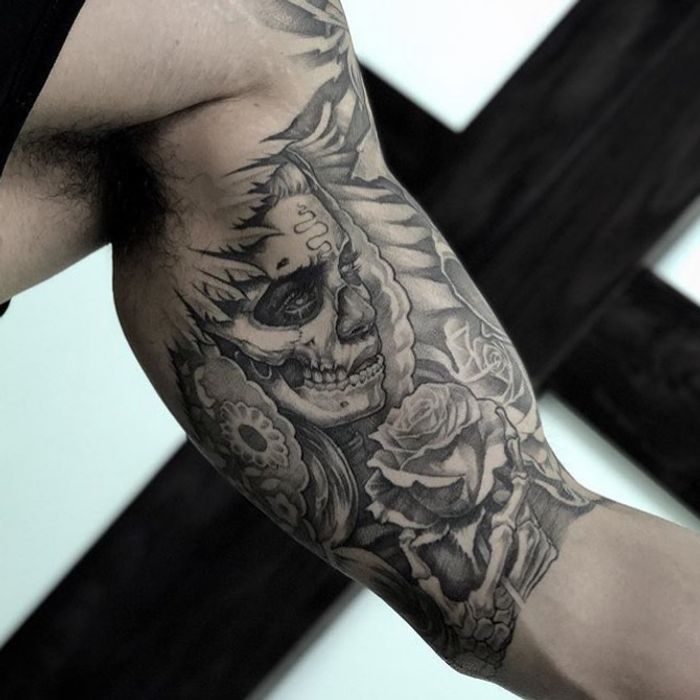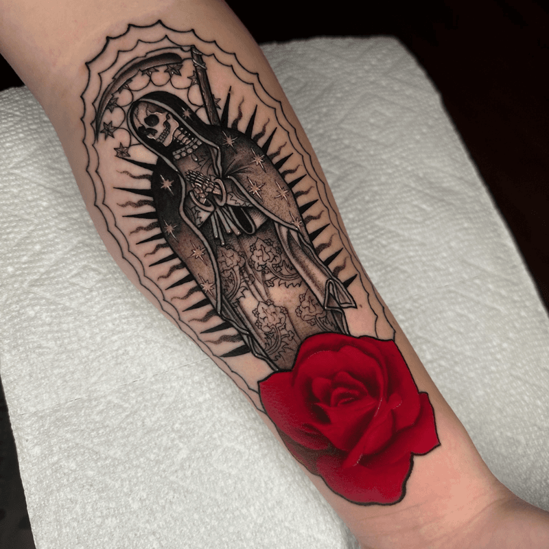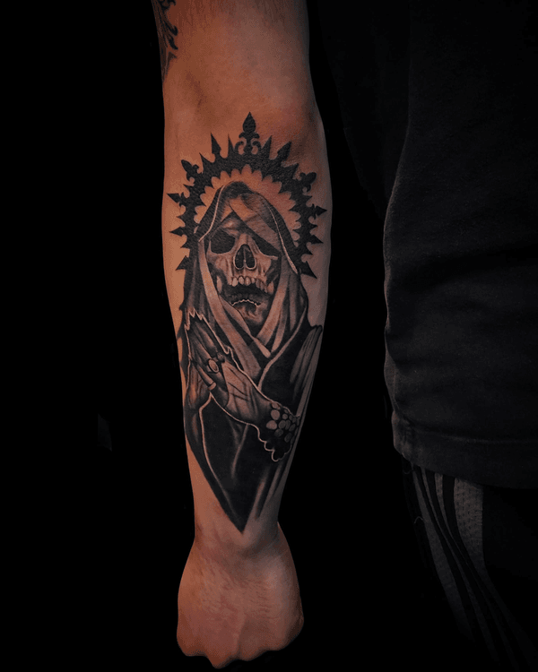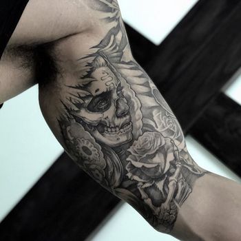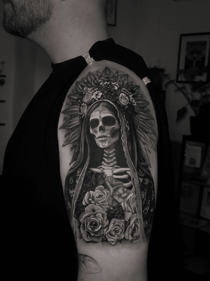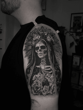 Santa Muerte tattoo art featuring the Lady of Holy Death, sugar skull imagery, and Mexican folk saint designs. Explore traditional, realistic, and ornamental Santa Muerte artwork.
