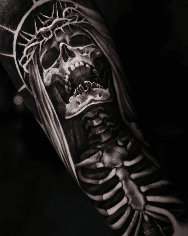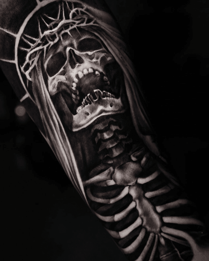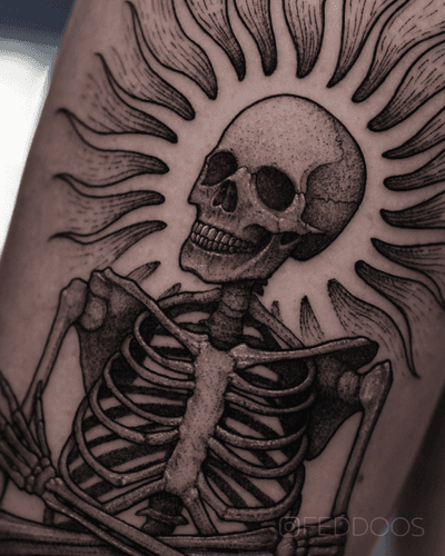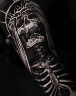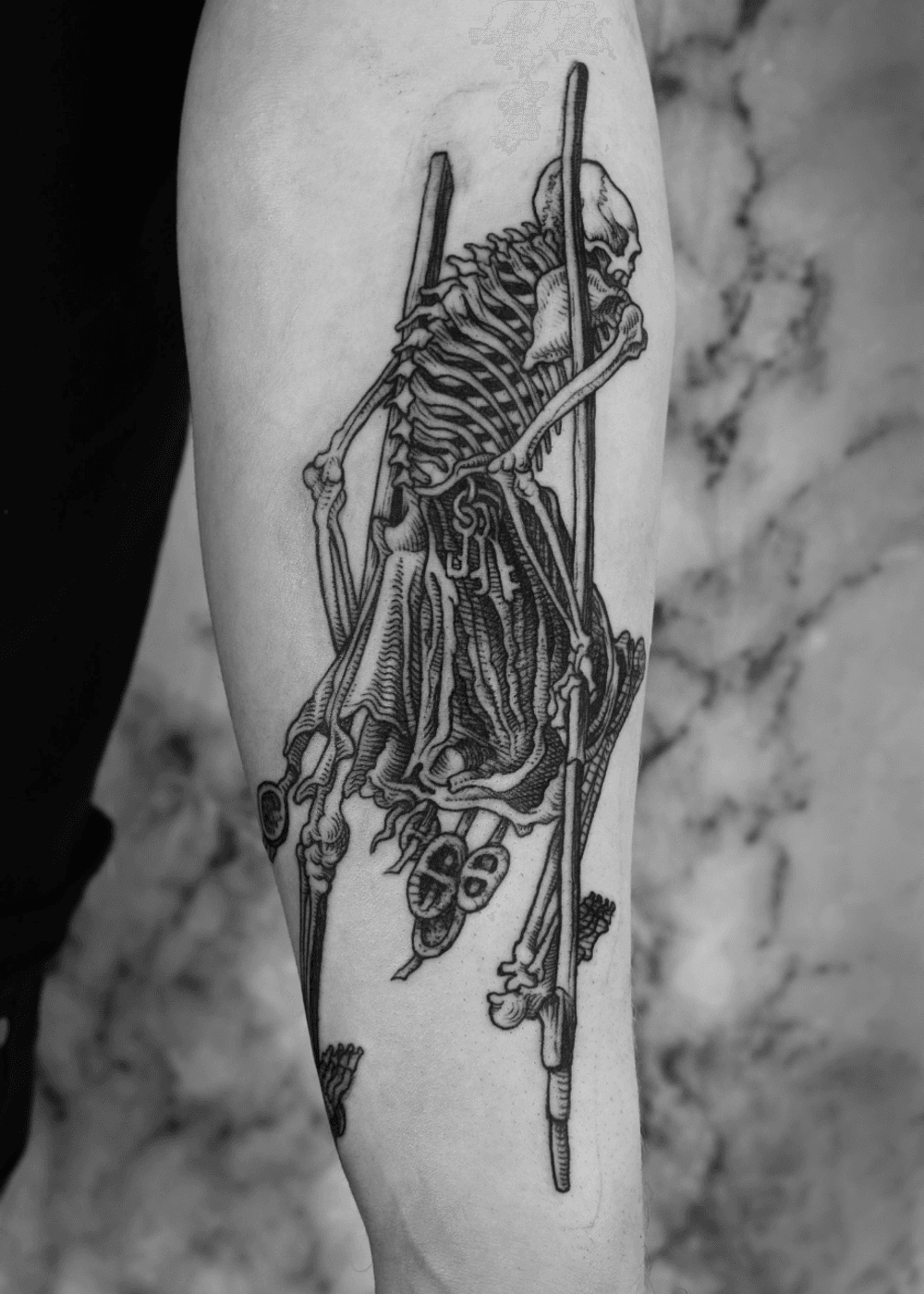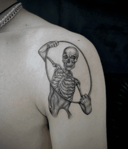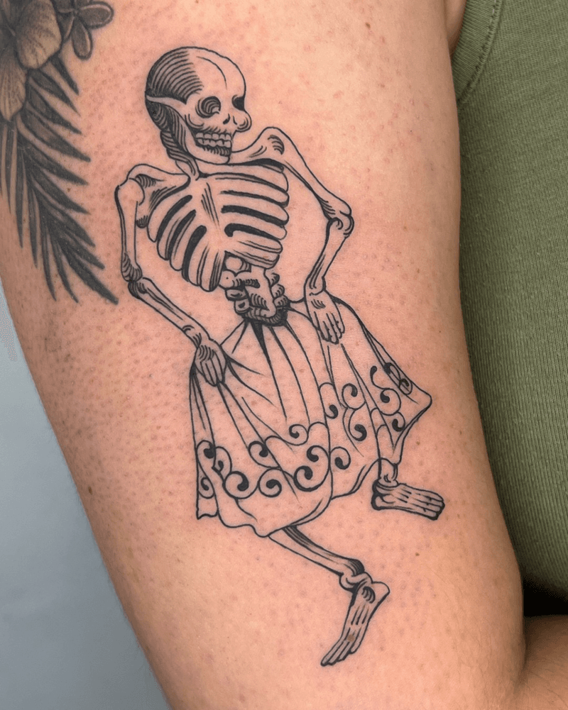 Skeleton tattoo art featuring dancing skeletons, anatomical bones, skeletal hands, and Day of the Dead compositions. Explore traditional, realistic, and illustrative skeleton designs.